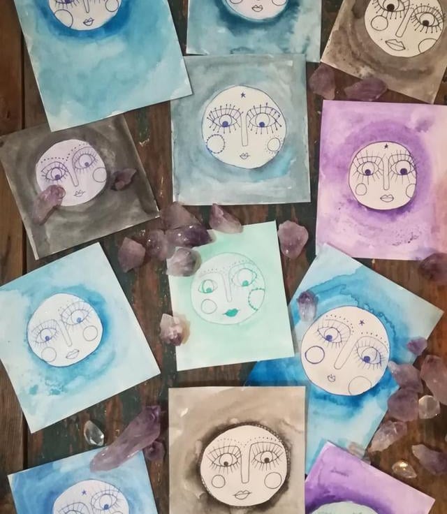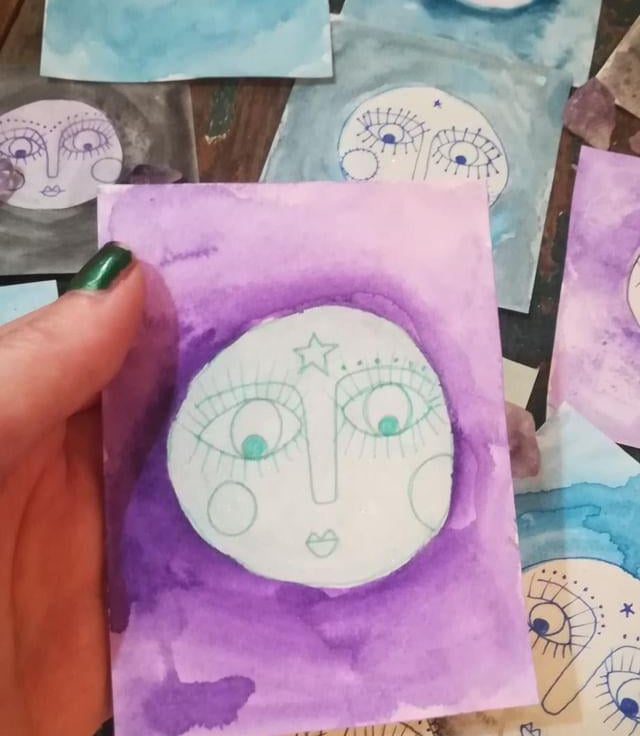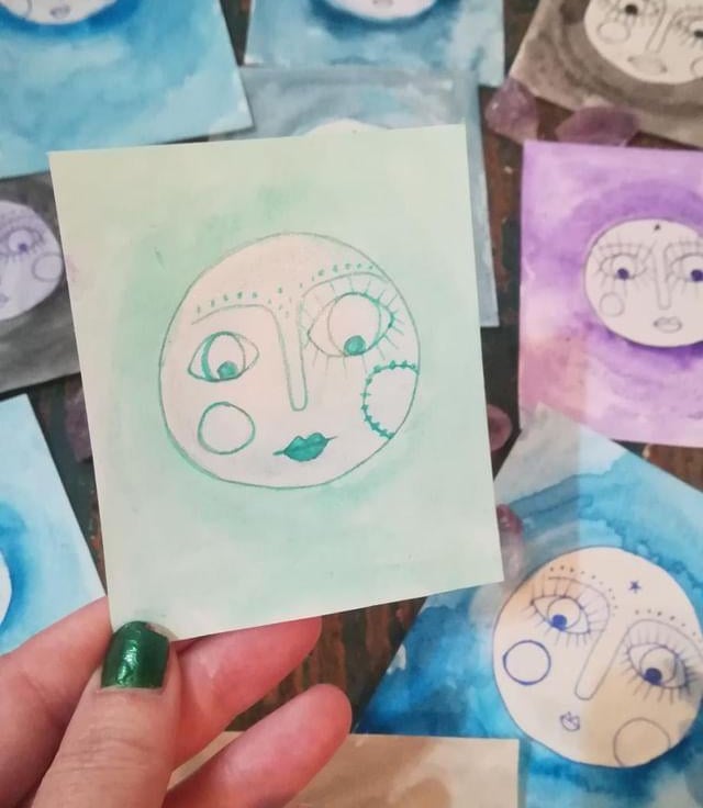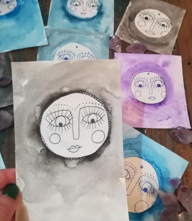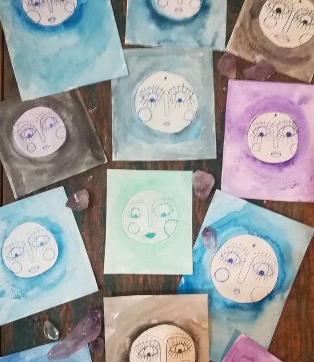 Mini moon paintings, I create these in watercolour, glittering watercolours and pens.