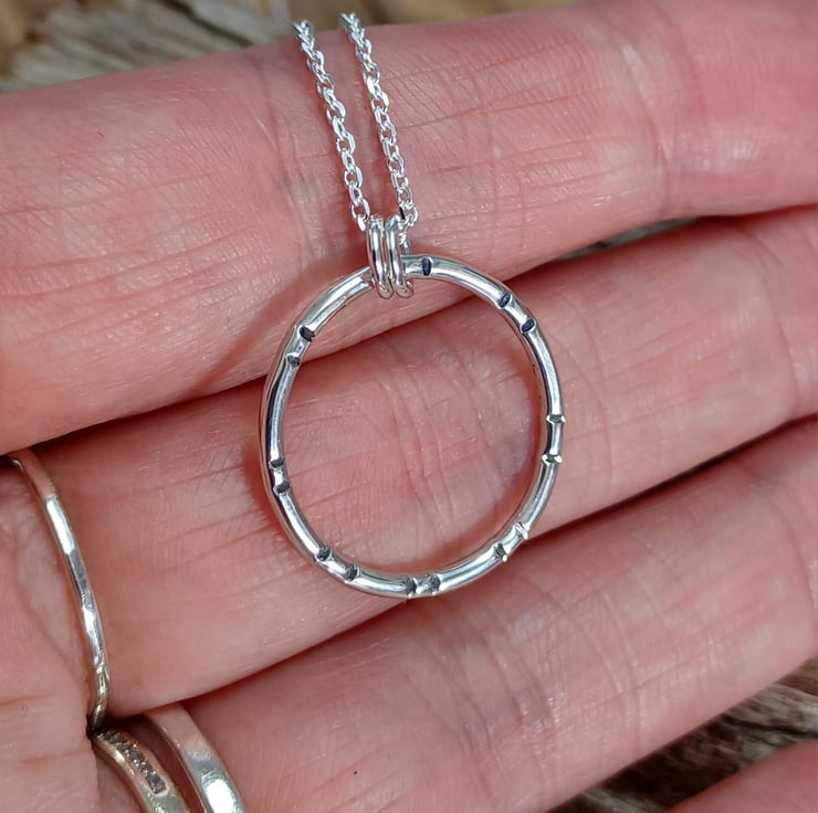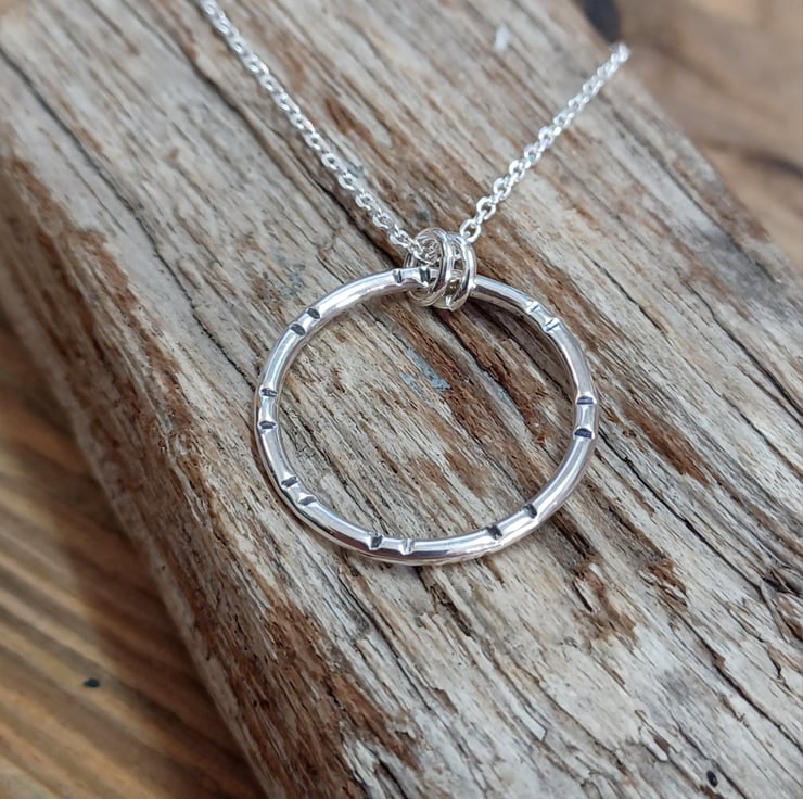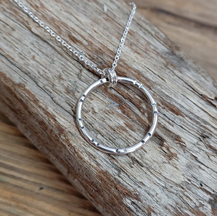 A simple sterling silver hoop made from silver wire . Slight texturing around the hoop adds a little interest. Polished to a high shine .Suspended from an 18 " sterling silver diamond cut trace chain.
