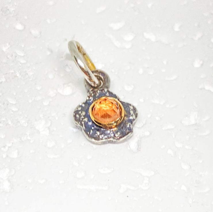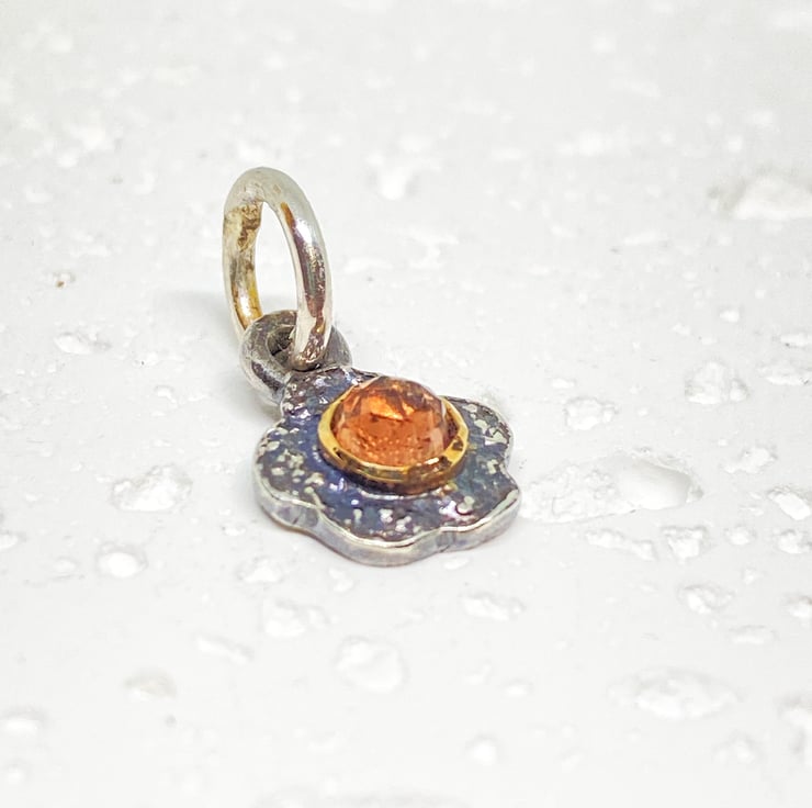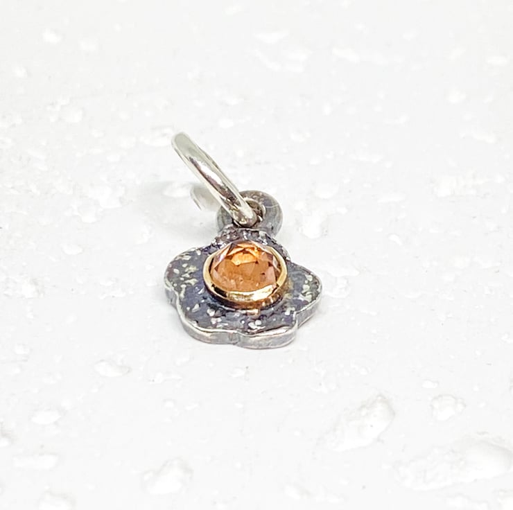 Tourmaline has been wrapped in 9ct gold and added to a sterling silver daisy backplate. The daisy has been textured with silver dust and patinated. It’s part of my starry night collection.