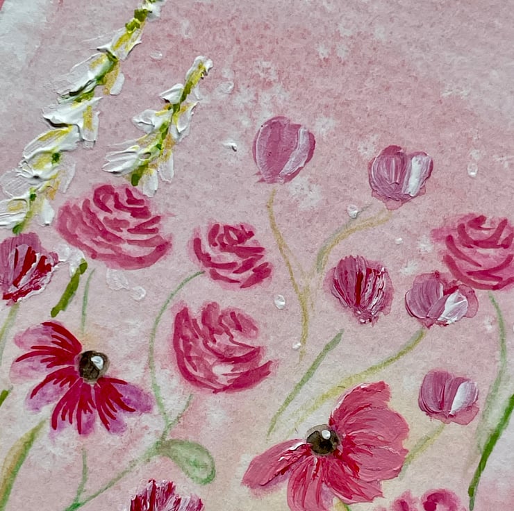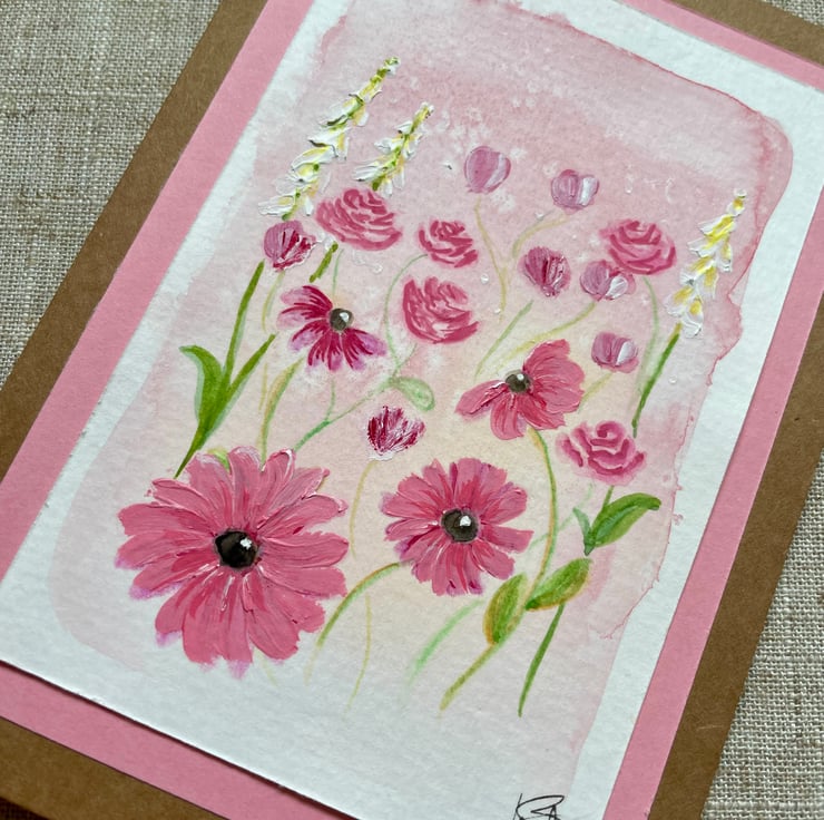 This blank greeting card features some pretty pink daisy type flowers, hand painted in acrylic paint onto a background pink wash of watercolour with a couple of contrasting tall white foxglove type flowers and mounted onto a complementary delicate pink background border, the addition of acrylic paint allows me to add a bit of texture too, it is left blank for any occasion and would make a lovely card for a birthday, Mother's Day, or just sending a pretty note to a friend.