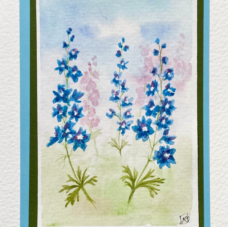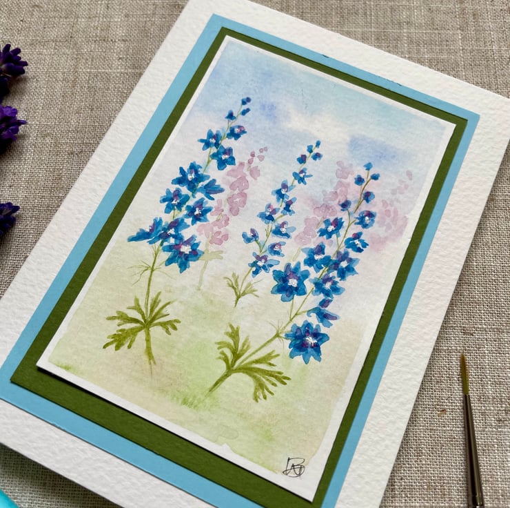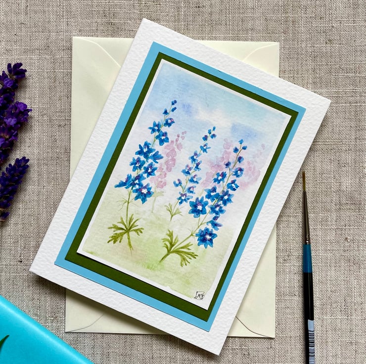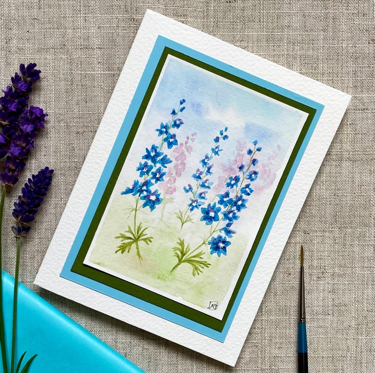 This hand painted blank card features a lovely wash of greens, blues and pink with delicate stems of Larkspur flowers painted over the top, inspired by my little wildflower garden.