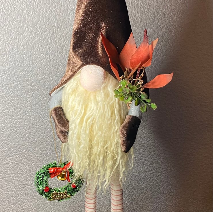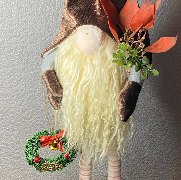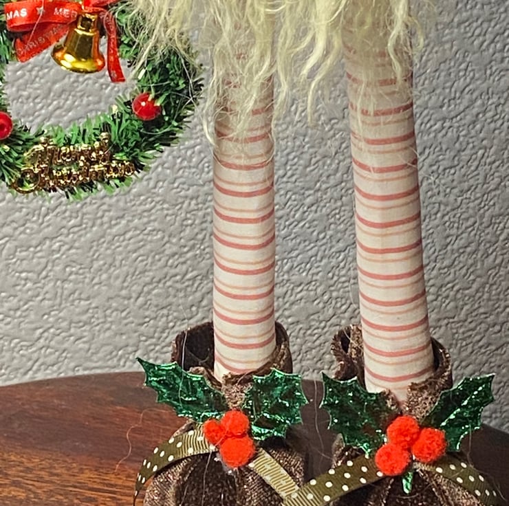 He has a Brown Velvet Hat, sporting a little bell, over a luscious faux fur beard and pink velvet bulbous nose, which is starting to go a bit red with the cold. He has brown velvet gloves on, which match is boots, which also have holly and bow decorations. His long pink candy stripe legs are sticking out of short trousers made from light grey felt with light brown spotted ribbon detail and green button detail.