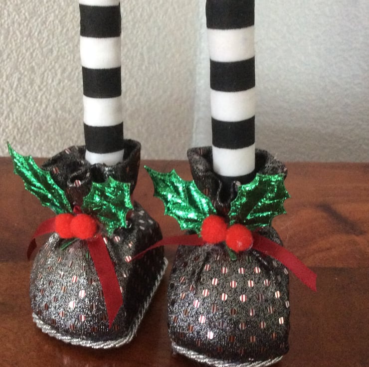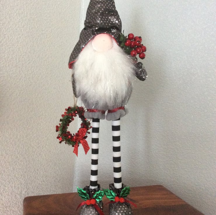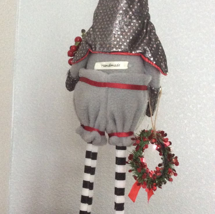 He has a Grey glittery Velour Hat, sporting a little silver star, over a luscious faux fur beard and pink velvet bulbous nose, which is starting to go a bit red with the cold. He has matching gloves and boots, which also have holly and bow decorations. His long black and white stripe legs are sticking out of short trousers made from light grey felt with Red ribbon and silver star decoration.