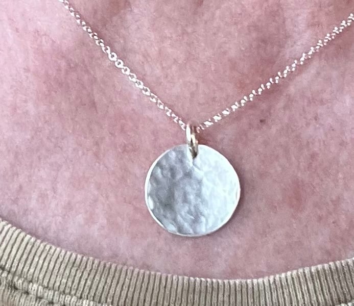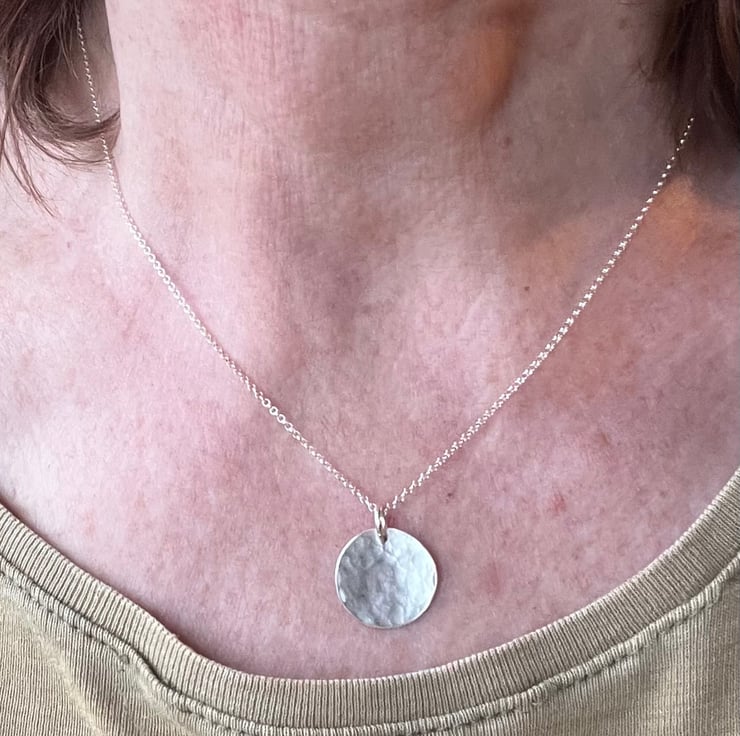 A delicate silver circular shaped pendant, which has been slightly hammered for an interesting surface texture . It hangs from a sterling silver belcher chain, joined with a sterling silver ring. All the silver is eco sterling silver.