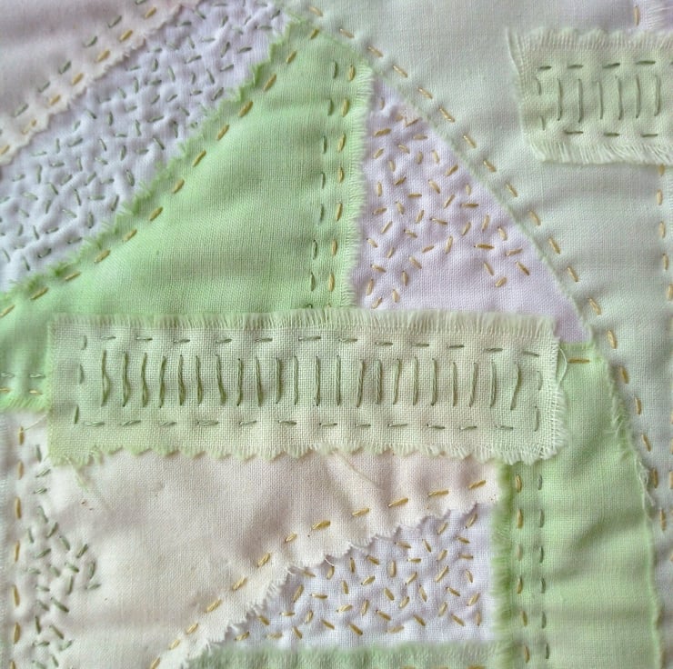 I then start to hand stitch intuitively and mindfully, allowing myself to be guided by the piece as to how and where I stitch; this creates interest and texture within the piece on both the shapes and in the negative spaces.