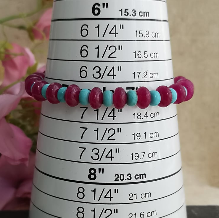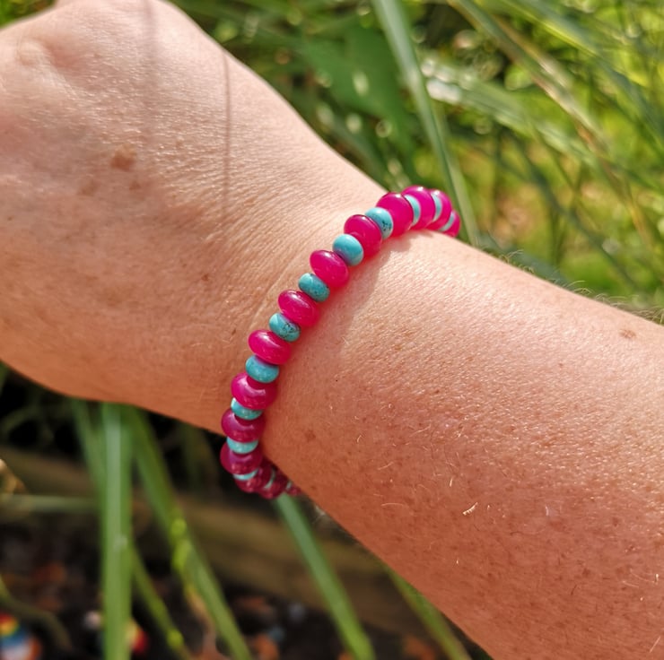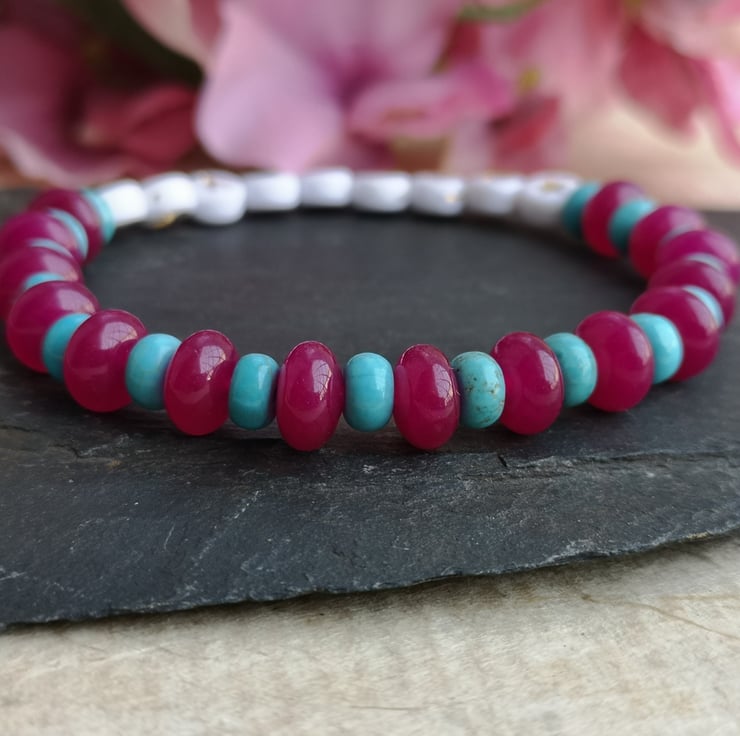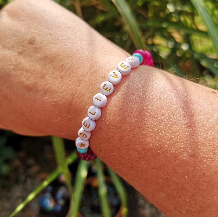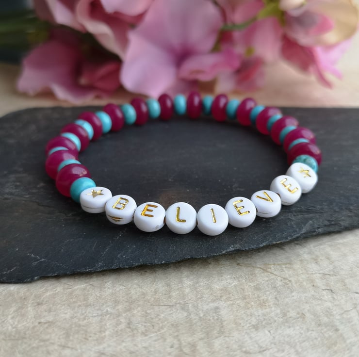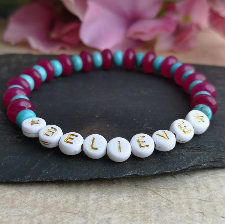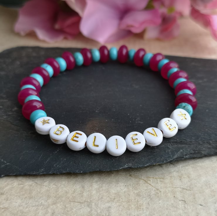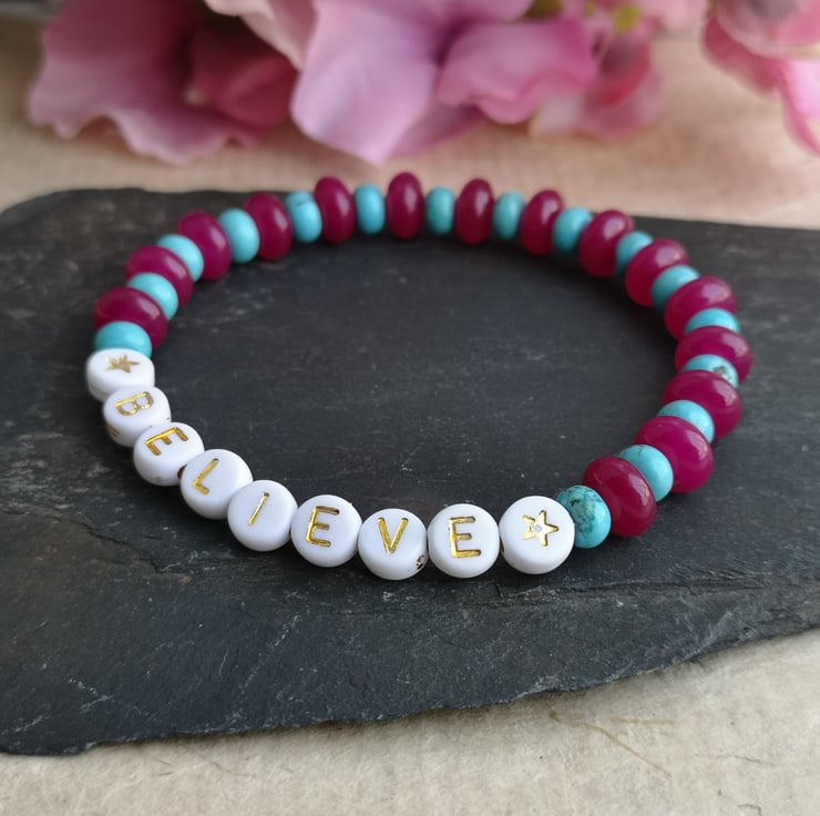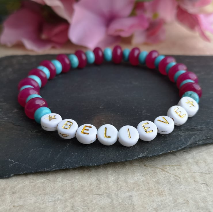 This vibrant bracelet encourages you to "believe"! It features a contrasting pairing of pink chalcedony and turquoise semi precious gemstones, and white plastic beads with gold lettering, all of which have been strung onto strong beading elastic.