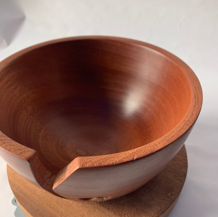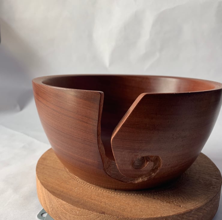 A Mahogany Yarn Bowl measuring 8 inches wide and 4 inches deep. This yarn bowl has a weighty base so as to remain upright when in use.