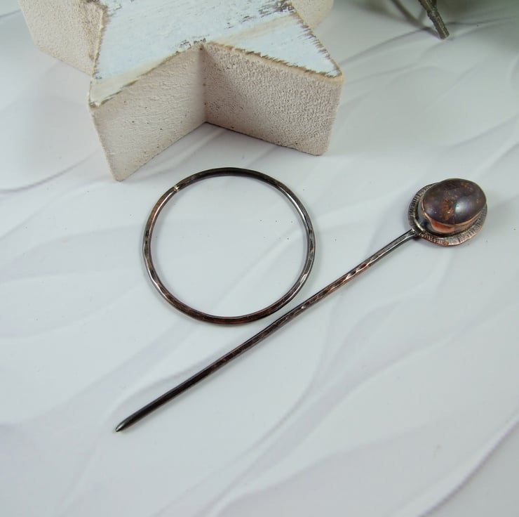I created the base by cutting an oval shape from copper sheet then texturing around the edge for decoration. I made the marbled clay and resin from using a polymer clay with inks and metal leaf to create a marbled pattern then formed inot a cabachon and cured. After curing I coated in clear resin. The cabachon is set in a bezel on the pin made to fit perfectly.