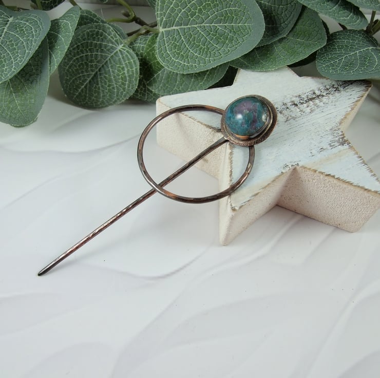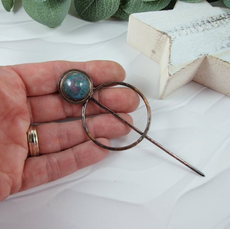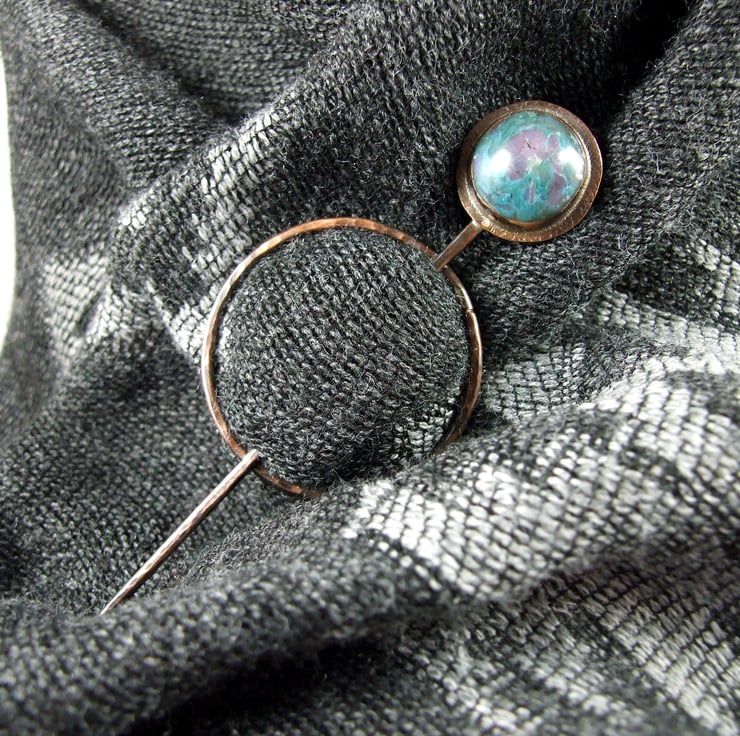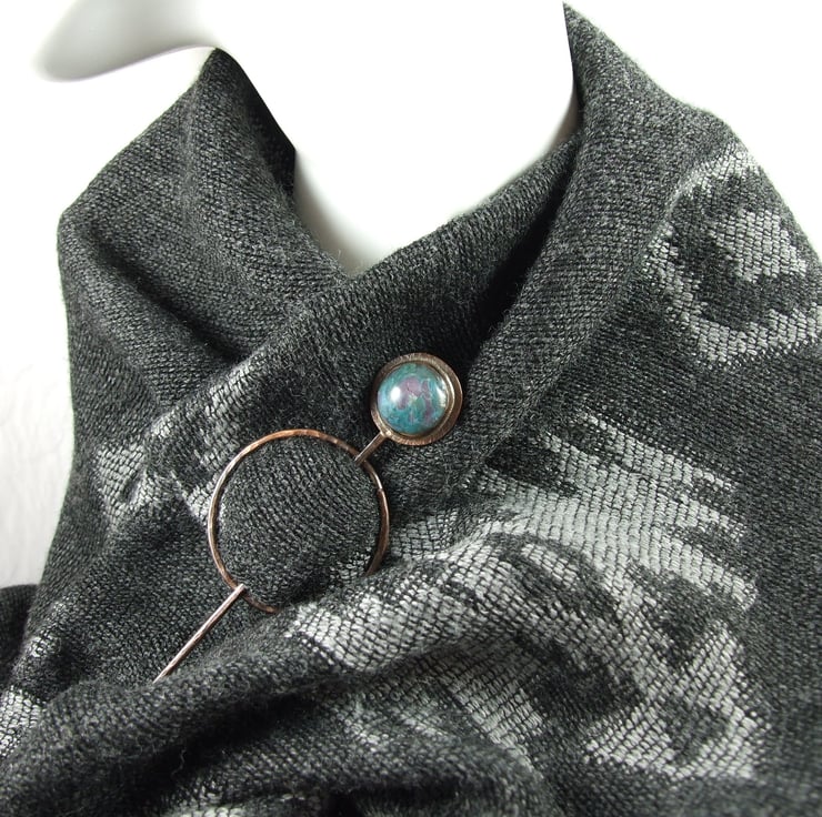 Copper shawl pin brooch with my own handmade blue and lilac marbled clay and resin cabachon for Open Weave or Knit Shawl, Scarf, Wrap or Cardigan.