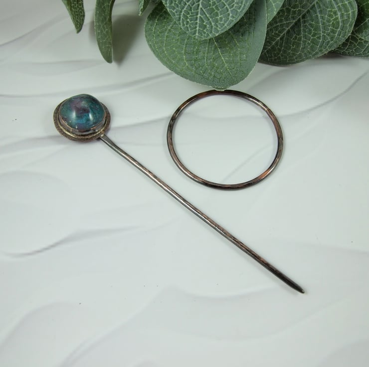 I created the base by cutting an round shape from copper sheet then texturing around the edge for decoration. I made the marbled clay and resin from using a polymer clay with inks and metal leaf to create a marbled pattern then formed into a cabachon and cured. After curing I coated in clear resin. The cabachon is set in a bezel on the pin made to fit perfectly.