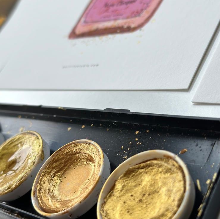I was introduced to Veuve Champagne a number of years ago and so its a 'go to' as a very special treat with fellow Veuve drinkers. I love the vibrancy in this hand finished print run. The colours are amazing especially with the metallic paint additions.