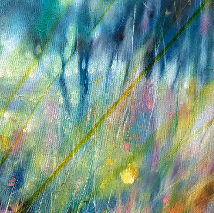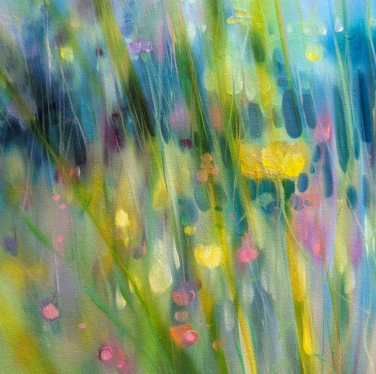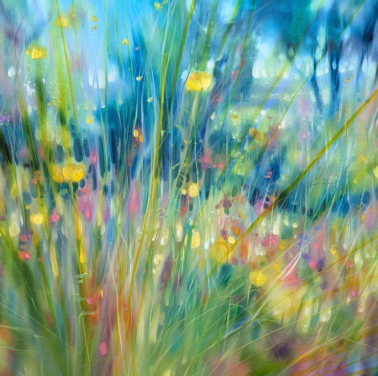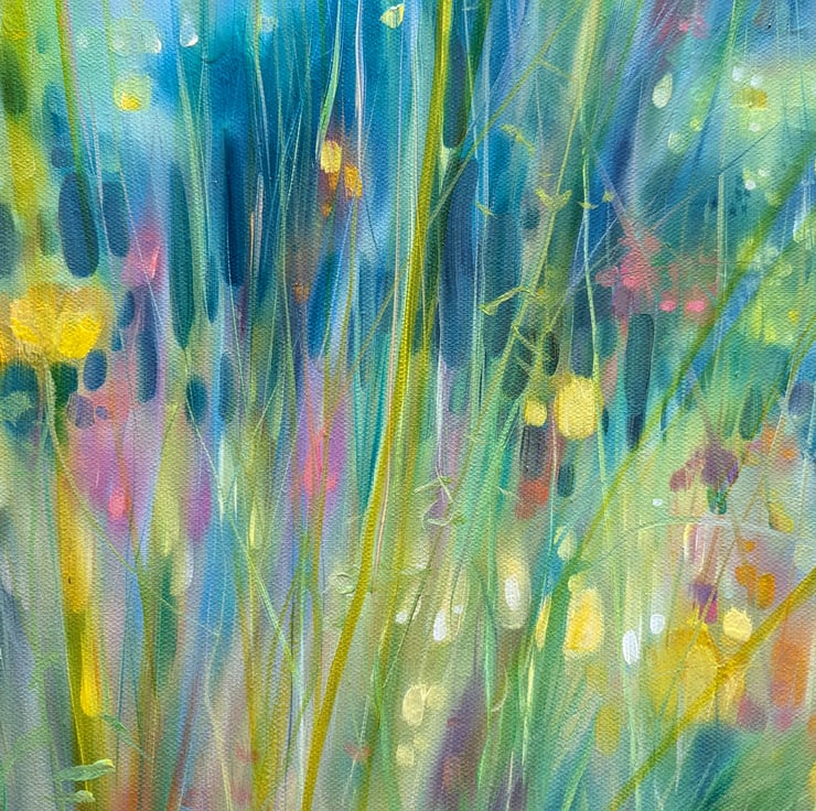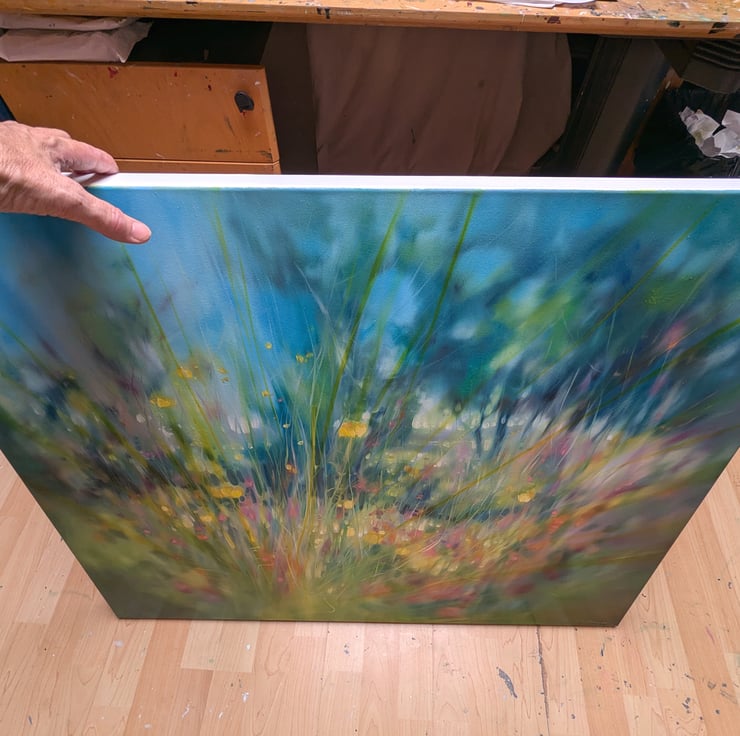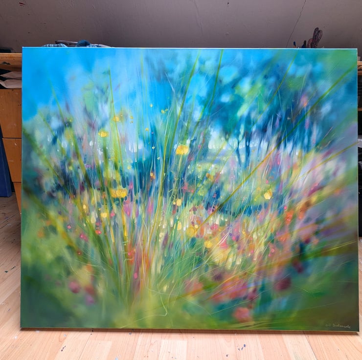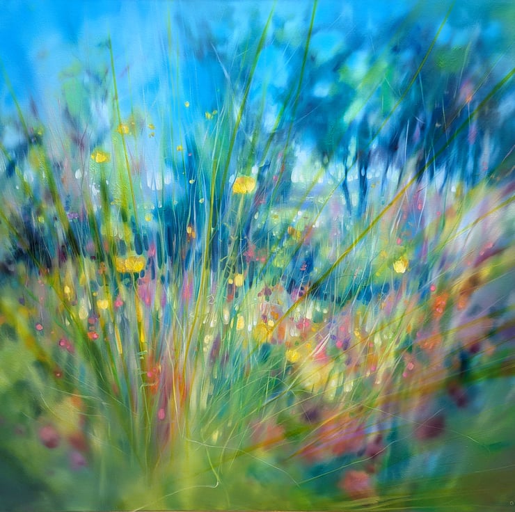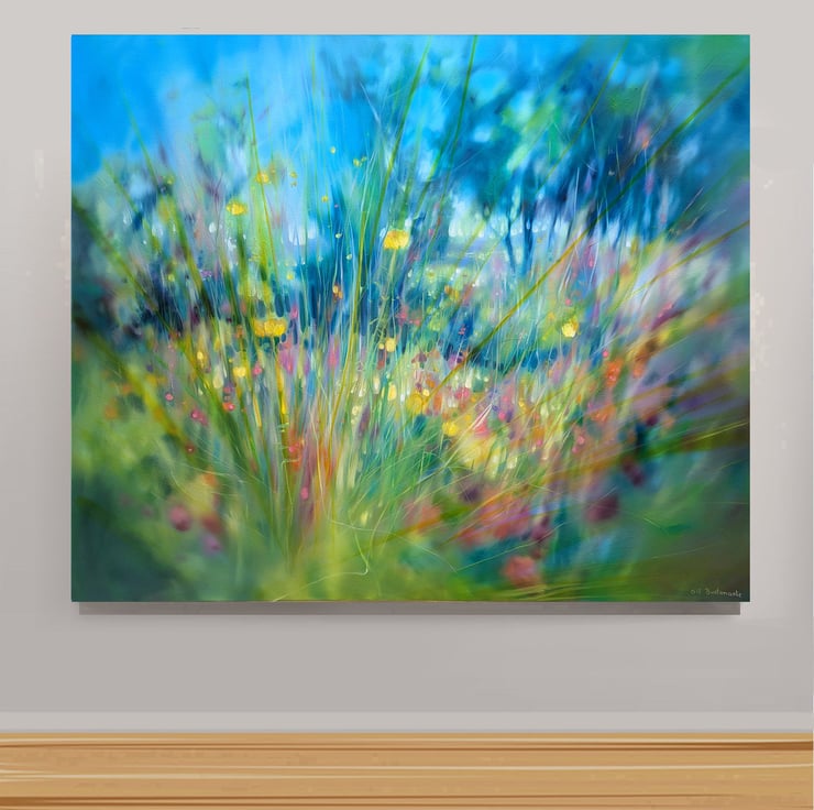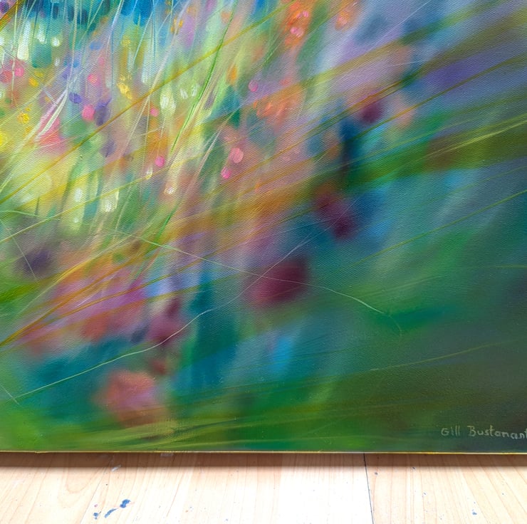 Chaos in the Meadow is a joyful semi abstract oil painting illustrating the sheer chaos of nature that you find in a flower meadow in summer. It is 36x30x1.5 inches. The painting is semi abstract in style and is extremely colourful. Many different types of flower and grasses are hinted at and all of them are trying to get attention which causes a beautiful chaos. This painting was made after a walk on the Sussex South Downs and I love how this one tiny patch of wildflower meadow showed me so much life and enthusiasm. I have used layers and glazes of colours to give this painting an iridescent glow and its colours change throughout the day because of this - almost like stained glass. Behind the flowers you can just about see some of the fields below the hills looking towards Lewes. It is dedicated to all those walkers, cyclists and environmentalists that I meet on the downs who are helping to keep this area beautiful and its nature thriving. Painted on deep edge canvas, edges white, ready to hang and no frame needed. Comes with a certificate of authenticity from the artist.