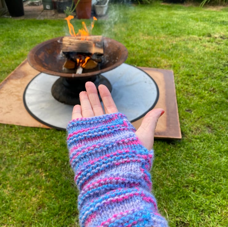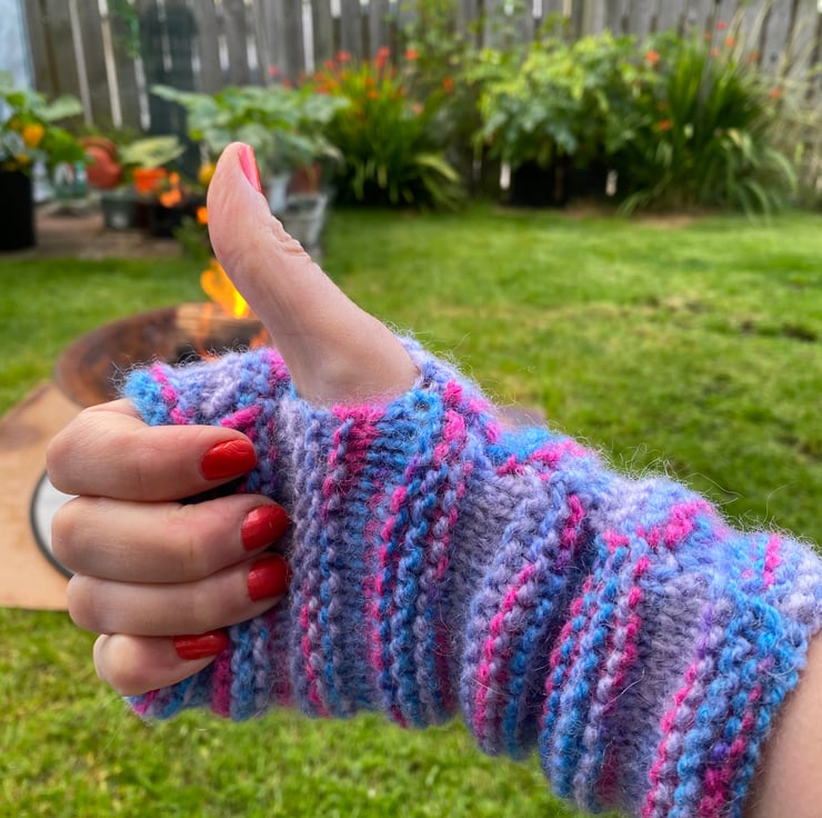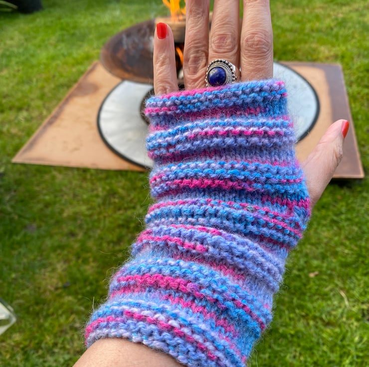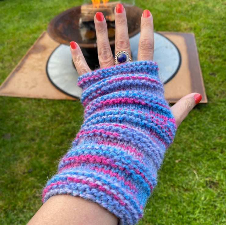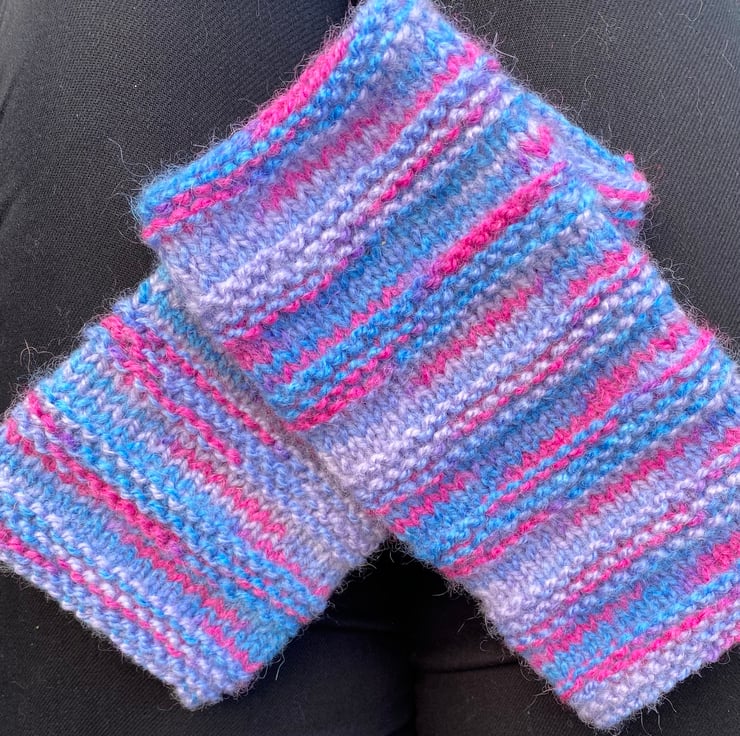 Hand-knitted fingerless gloves / wristwarmers made with a gorgeous, soft, and cosy wool-acrylic mixed yarn.