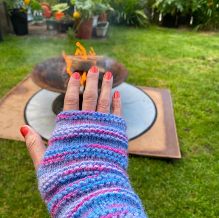 The colours in this yarn sang Northern Lights to me, and so the Aurora Fingerless Gloves were born.