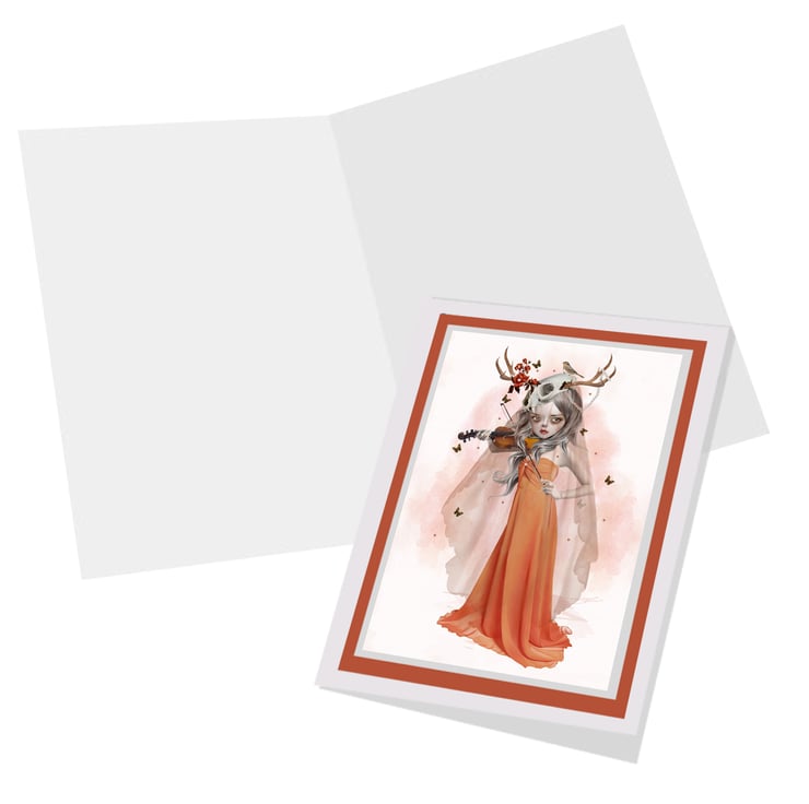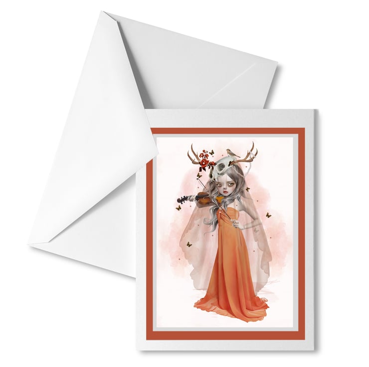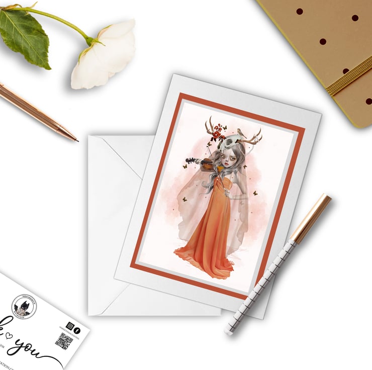 This enchanting greeting card features a whimsical girl with antlers, dressed in a flowing boho gown as she serenades the world with her violin. Her ethereal presence and the soft, natural tones evoke a sense of magic and serenity. Perfect for any occasion, this card captures the beauty of music and nature intertwined.