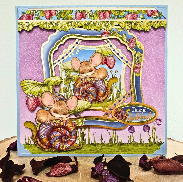 The card consists of ice-blue pearlescent card layered with purple, nature inspired cardstock. The gold foiled topper of a little mouse taking a nap on top of its snail friend lays in the middle of the card, surrounded by matching frames. A decorative panel of strawberry plants is on the top, while a duplicate but reversed image of the topper is on the bottom left corner, both raised for dimension. The sentiment "Time To Shellebrate" is on the right. The card is embellished with large diamante & colour drops. Inside, two coordinating inserts will provide you with enough space for your handwritten message & wishes. Finished with decorative photo corners for a unique result.