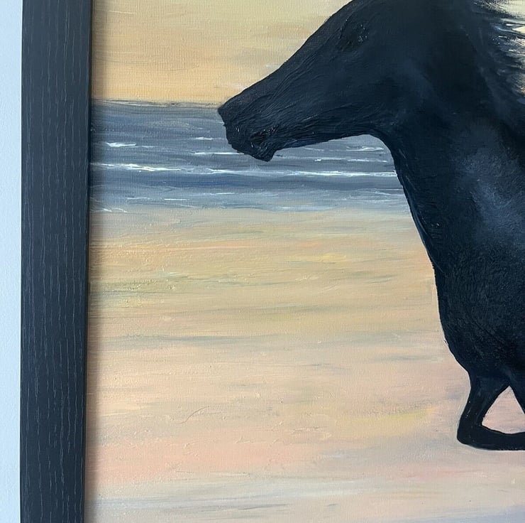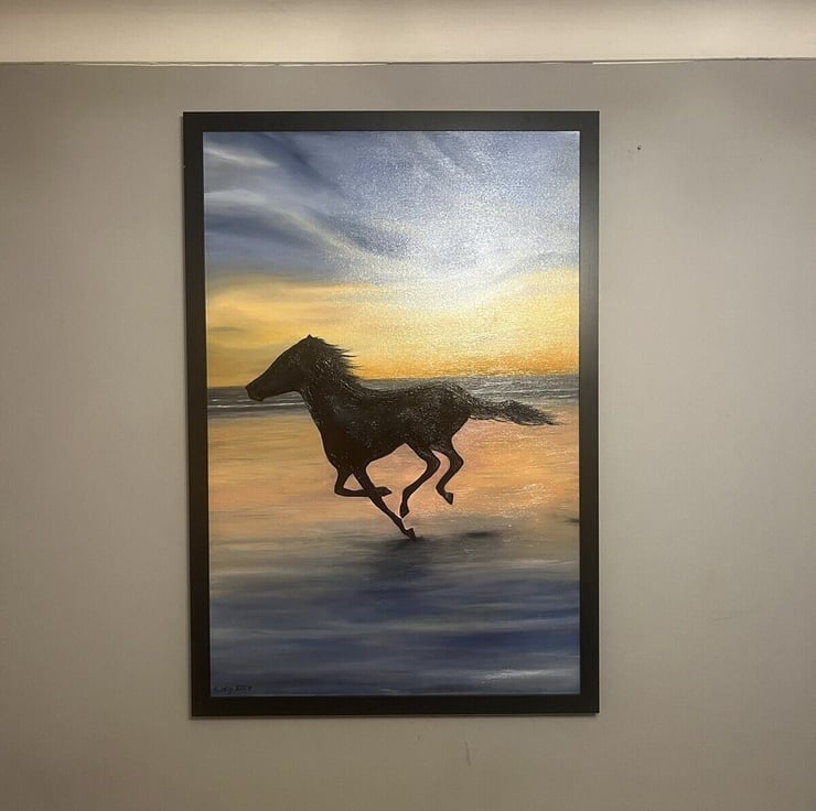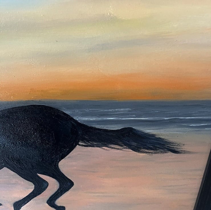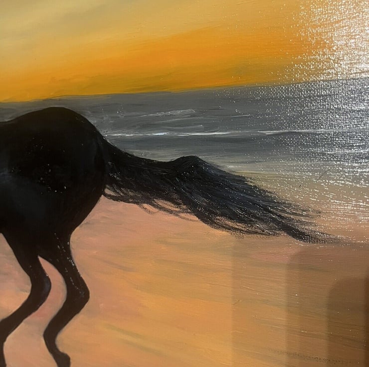 The painting depicts a running horse at low tide by the seaside, painted from memory after seeing a horse on the beach.