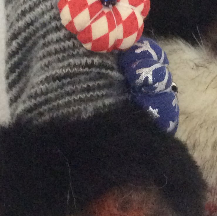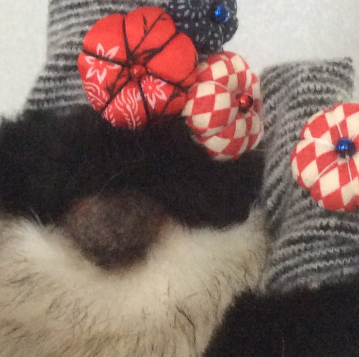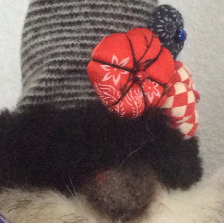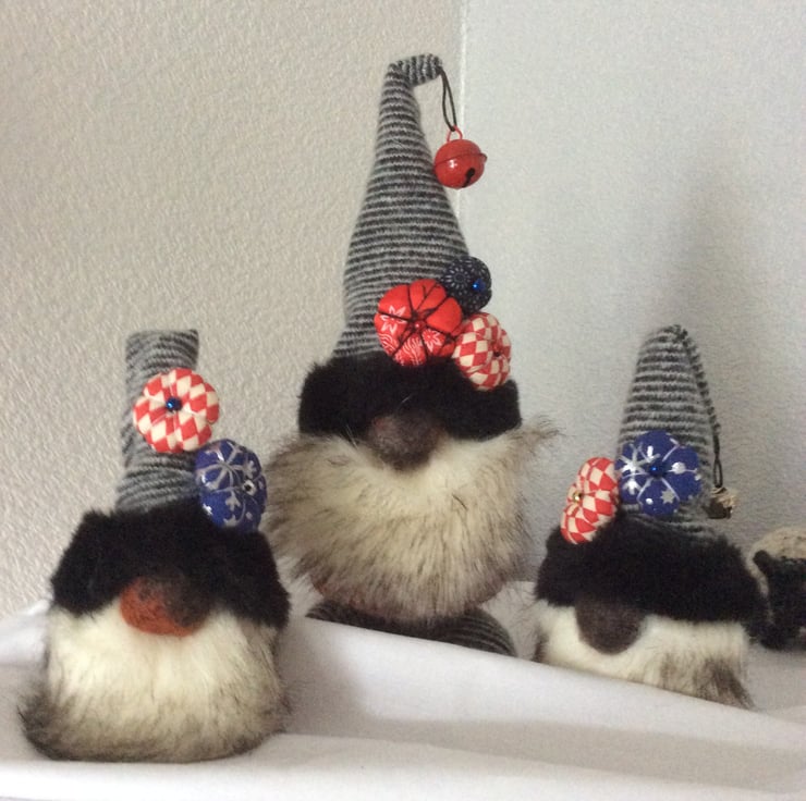He has a grey striped hat edged with faux fur, sporting a red bell and three little Christmas flowers over a luscious cream and light brown edged faux fur beard and felt bulbous nose. His body is a red & white harlequin patterned cotton and he has his two little matching apprentice gnomes with him who measure approximately 15cm. Although what apprentice gnomes actually do, I've no idea! Maybe they just keep him company?