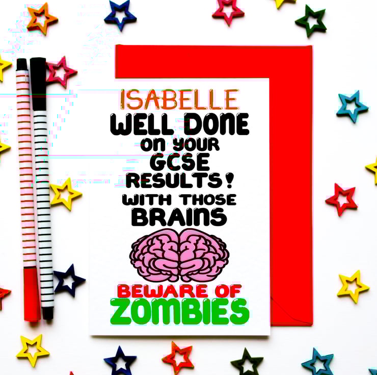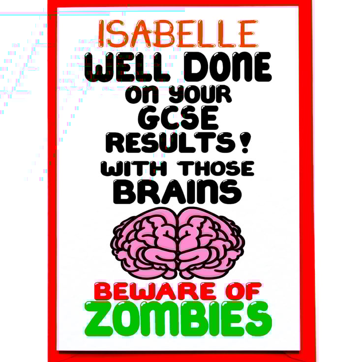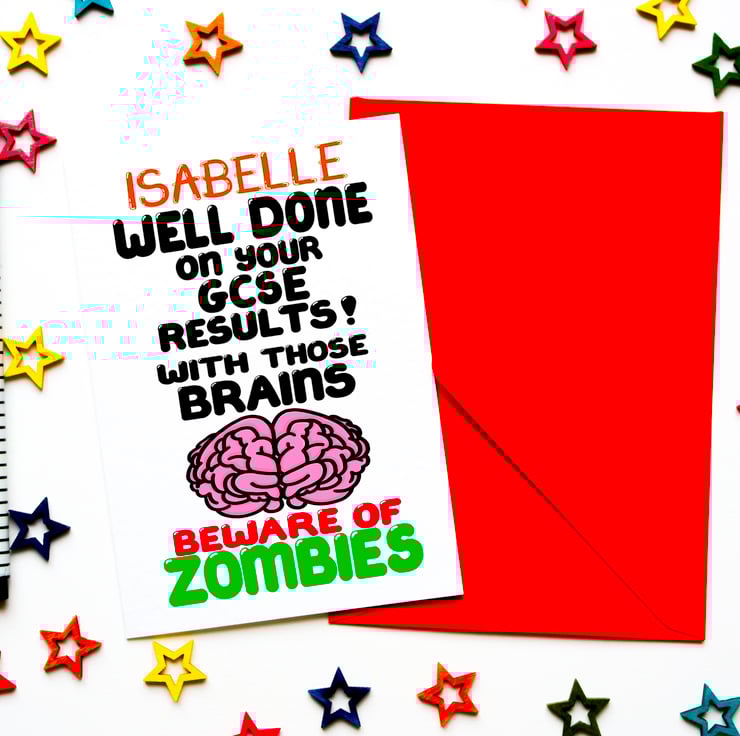 Greeting on front: NAME WELL DONE ON YOUR GCSE RESULTS! WITH THOSE BRAINS BEWARE OF ZOMBIES