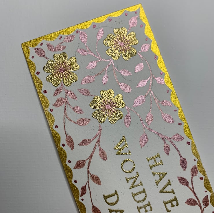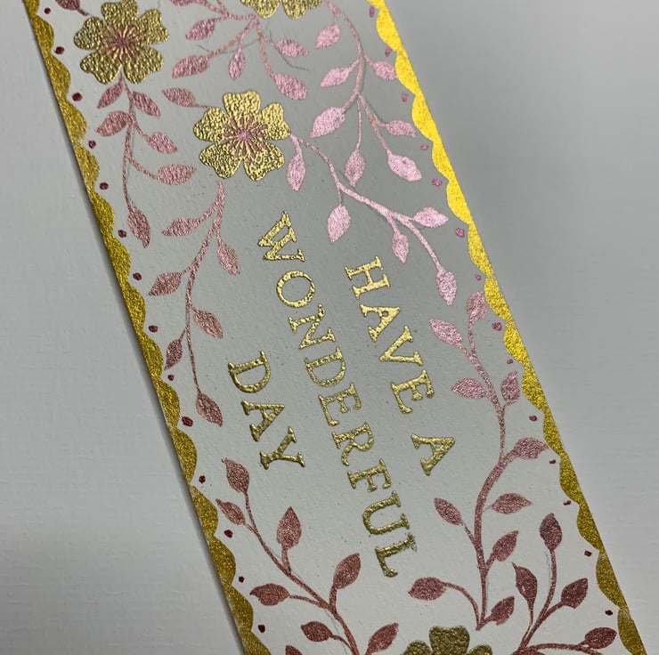 This pretty bookmark has a golden embossed message, surrounded by hand painted foliage in rose pink metallic paint and golden embossed wild roses. The hand painted border is in a shimmering antique gold metallic paint.