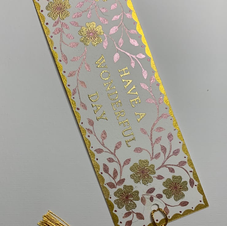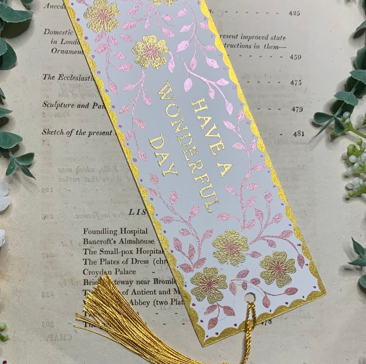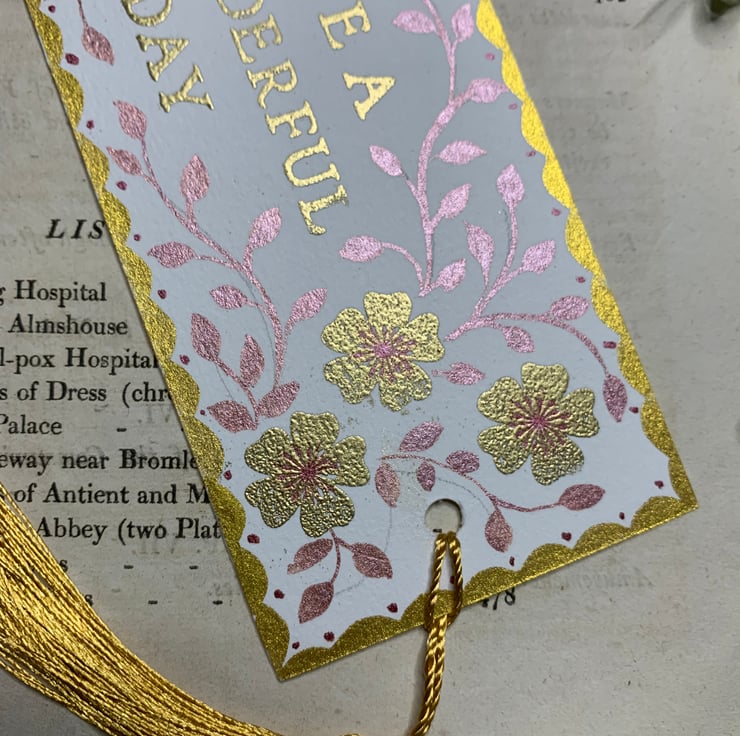 The bookmark has a pretty, antique gold-coloured faux silk tassel attached.
