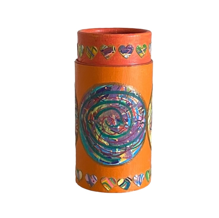 This versatile canister pot has a cardboard core, covered in a hand designed and pieced collage using hand tinted and printed paper with acrylic paint highlights.