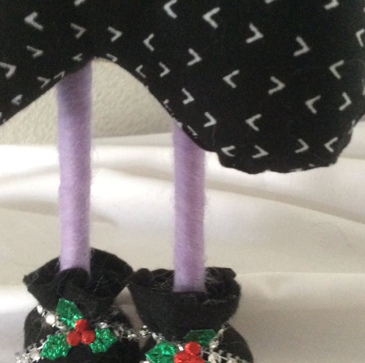 She has a black patterned body with a lovely purple glittery ribbon and bow, lilac mittens with button detail and lilac tights. Her black boots have diamanté detail with sprigs of holly. Hopefully they are keeping her feet warm