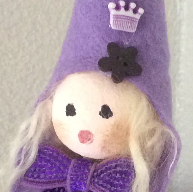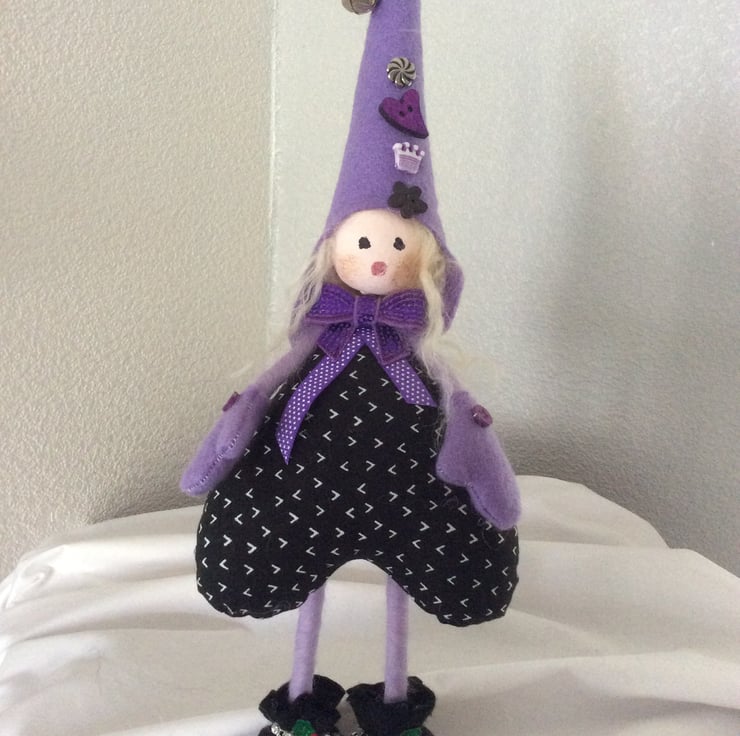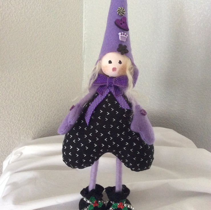 Merry Marilyn is a fat little Carol Singer, not that I’ve heard her sing yet! She stands approximately 35cm tall, to the tip of her beautiful lilac hat sporting a little silver bell and button details. She is made from various materials but mostly felt and cotton.