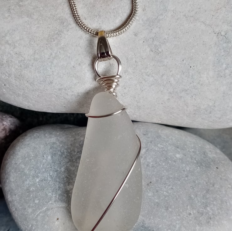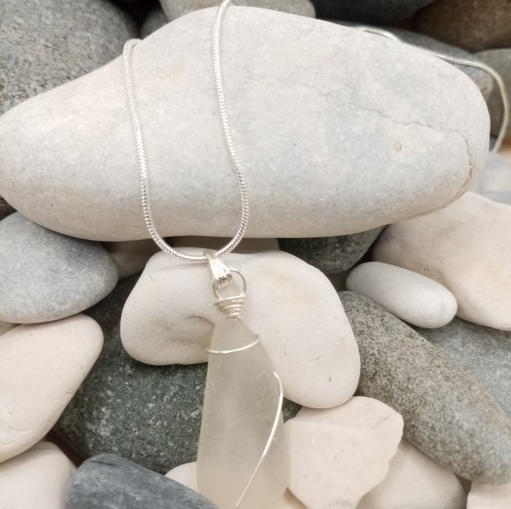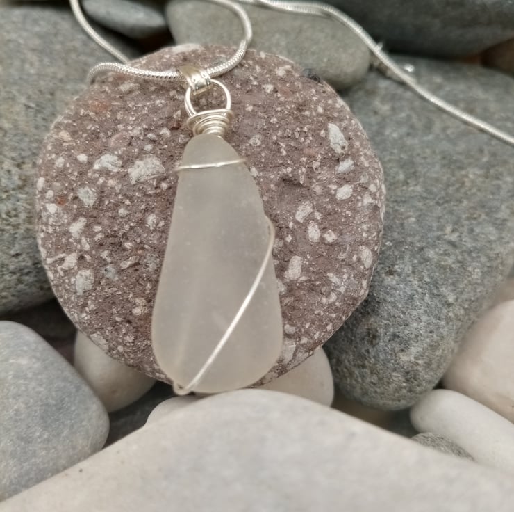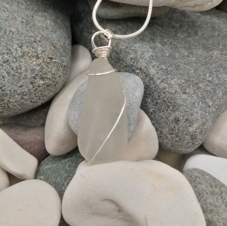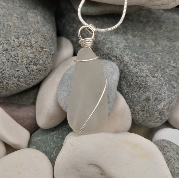 Wire-wrapped sea glass pendant with silver plated snake chain.