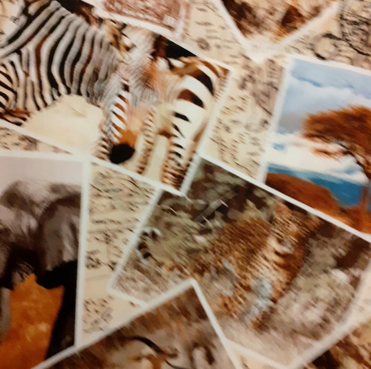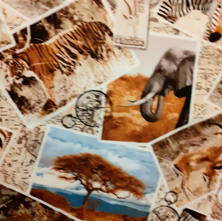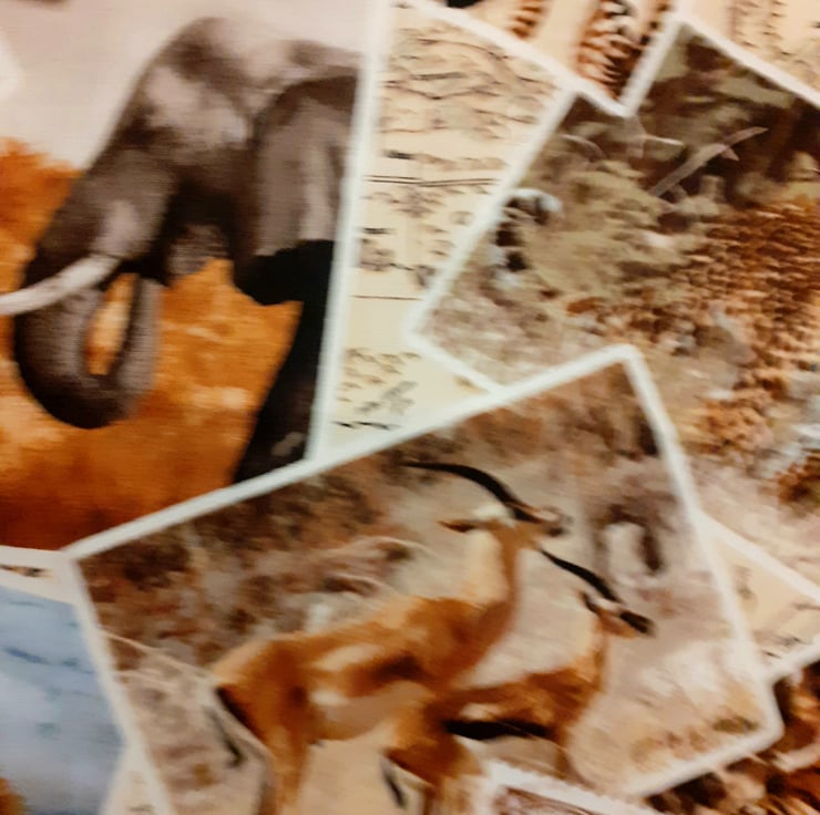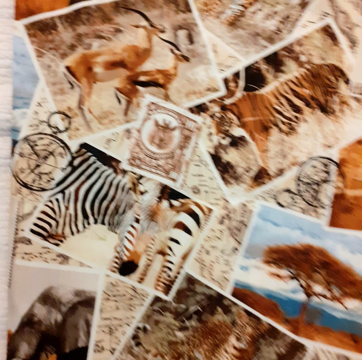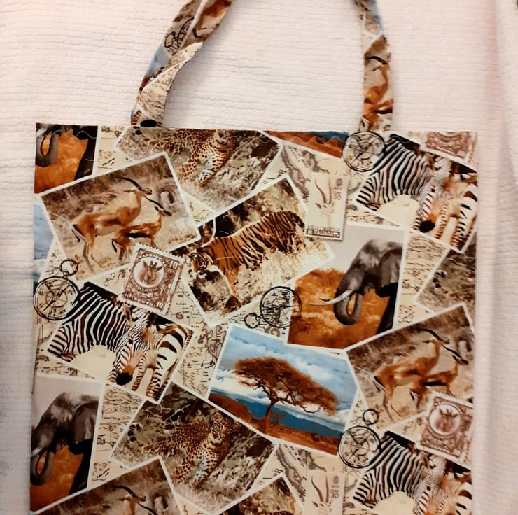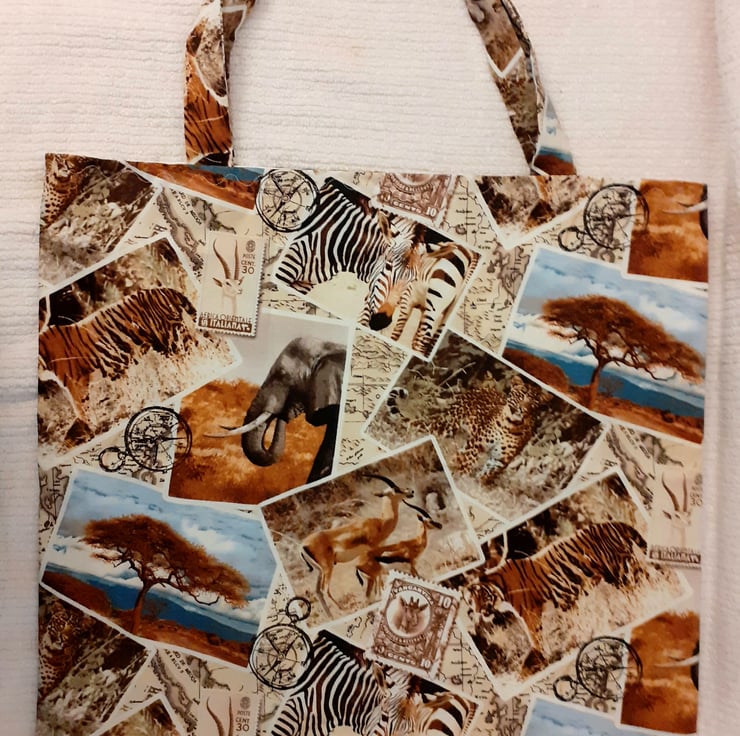 On Safari cloth bag with Giraffes, Zebras, Gazelles,Tigers, Elephants,Leopards, compasses and postage stamps all in squares on a cream map background. very comfortable to carry with cloth shoulder straps , ideal for carrying shopping or craftwork in . it measures approx 43cm x 43cm