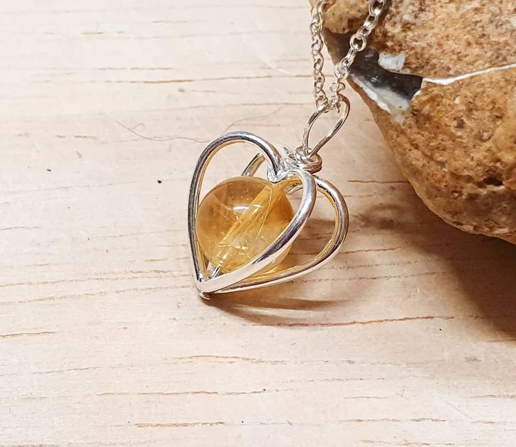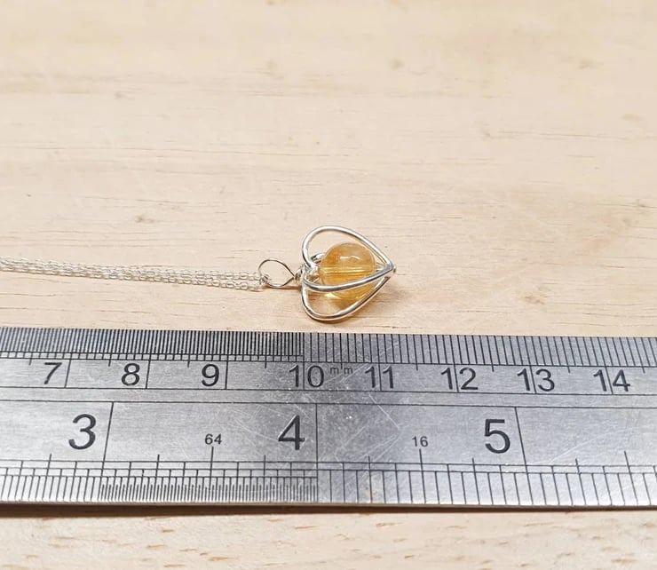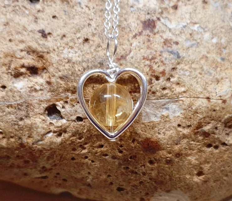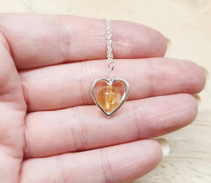 This is a women's tiny minimalist Sterling Silver Citrine heart pendant necklace with studded edge.