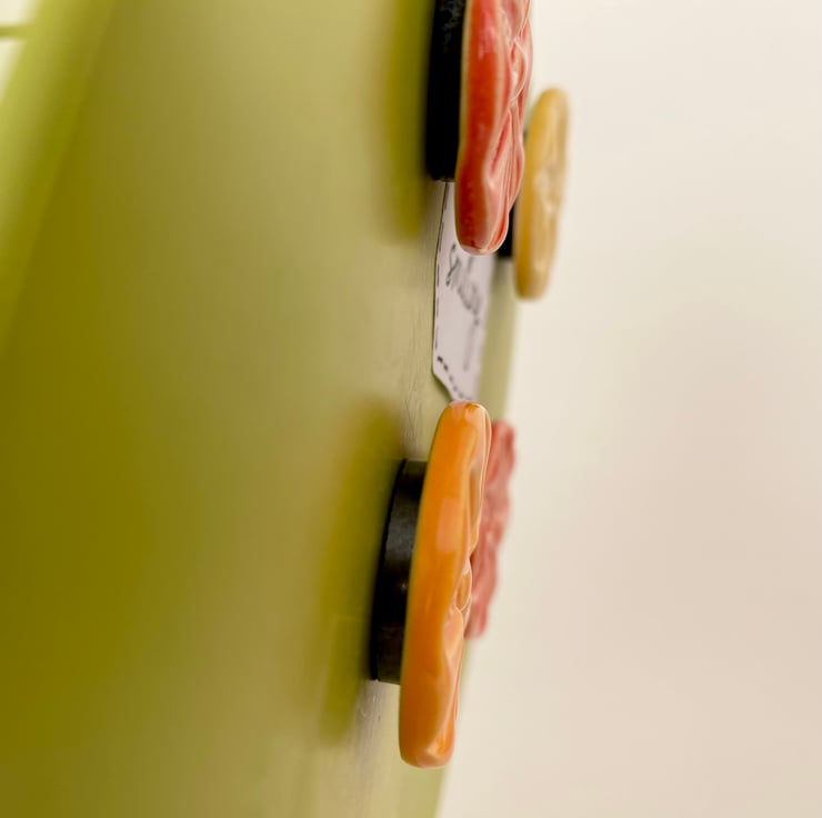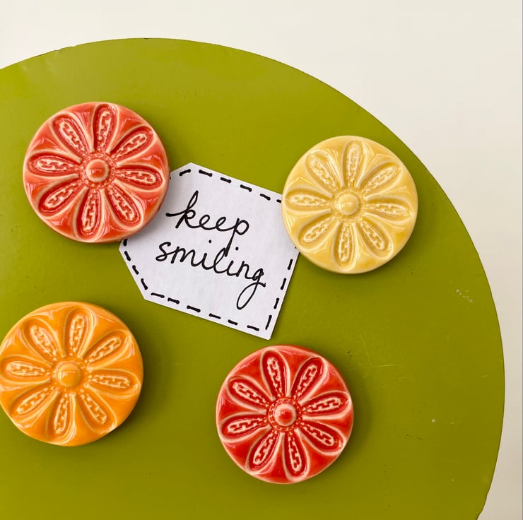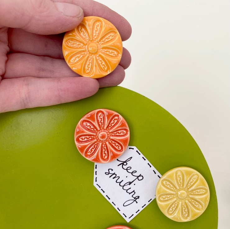 This listing is for a set of three summer flower fridge magnets, made from white earthenware clay. They are hand stamped with a floral design and have a small magnet glued to the back. They have been fired once to the bisque stage and then a second firing for the glaze. They measure approx 28mm diameter x 3mm deep.