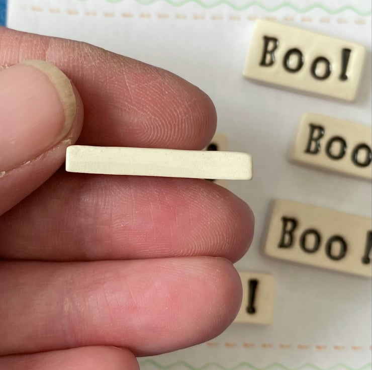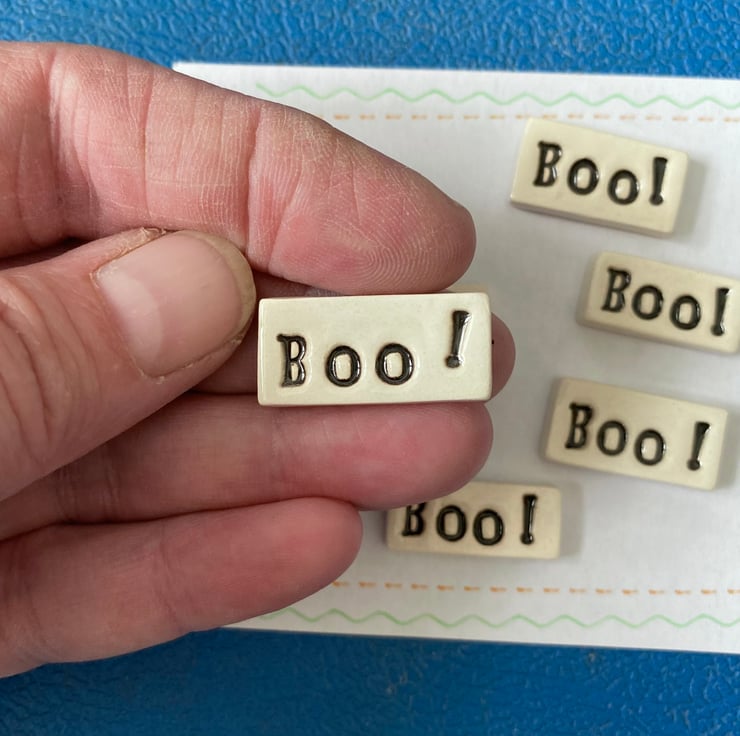 Small ceramic word tiles with the word BOO! Ranging in size from 1.5 - 2cm long x 0.8 cm - 1cm wide. 0.4cm thick. Set of 7