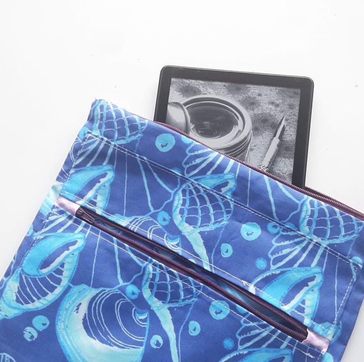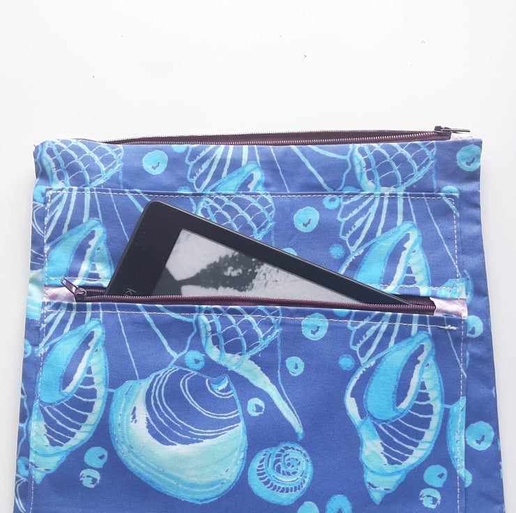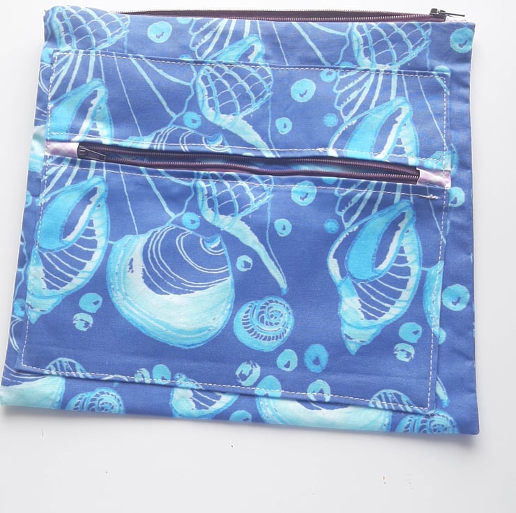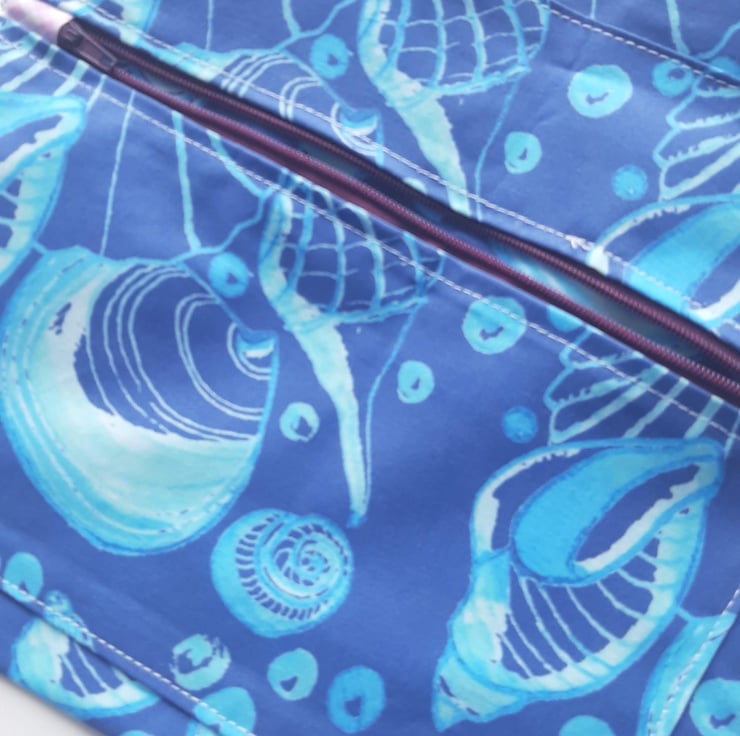 The fabric I have used is one of my designs from watercolour paintings of shells. It is printed on cotton and lined with shower curtain material to help with protection against moisture. I wanted it to be big enough for electronics , making it useful for the beach or the pool.