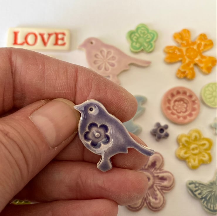 Small ceramic mosaic tiles including birds, words, flowers, leaves and a butterfly. Measuring from 0.5cm - 3cm x 0.4cm deep.