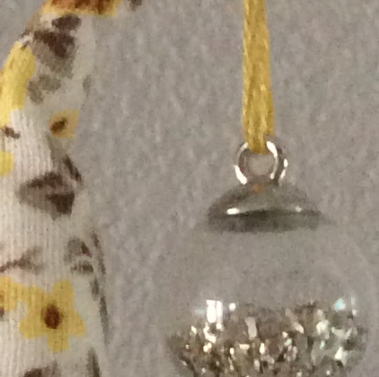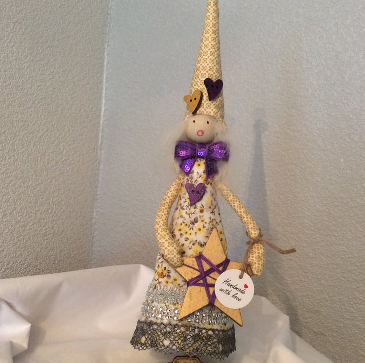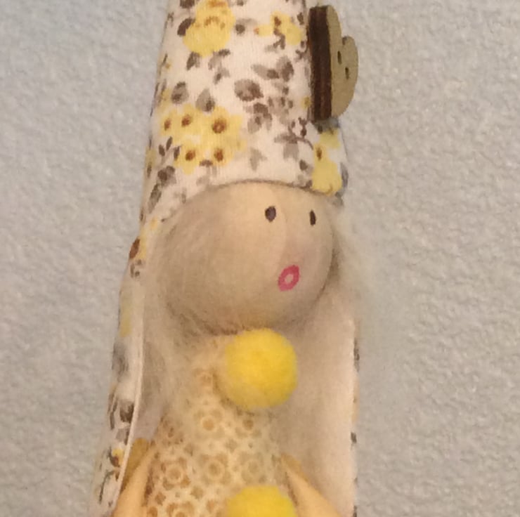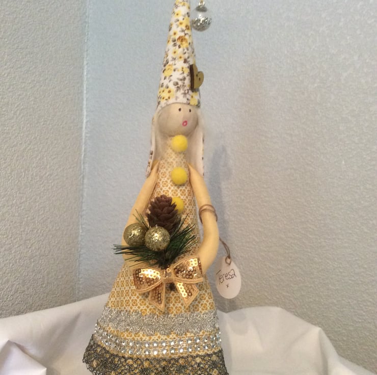 She is lovingly made from Cotton, wood and lace with a tall yellow flower pattern hat sporting a Christmas bauble and heart decorations. She has a yellow patterned dress with lace and diamante edging and yellow pom-pom decoration down the front. Carrying a lovely Christmas bouquet, she is all ready to burst into song!