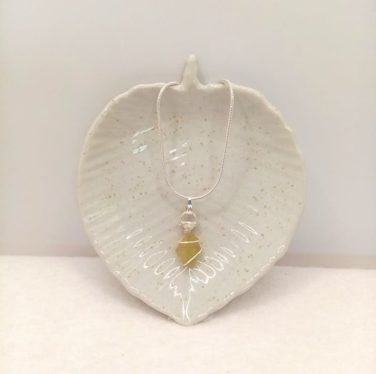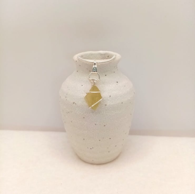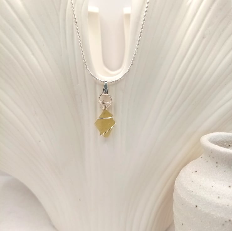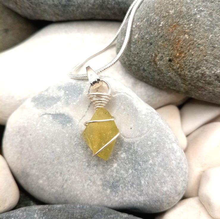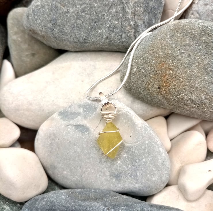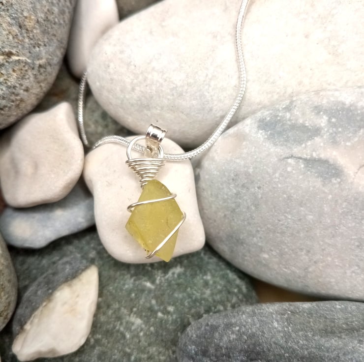 Wire wrapped sea glass pendant with silver plated snake chain.