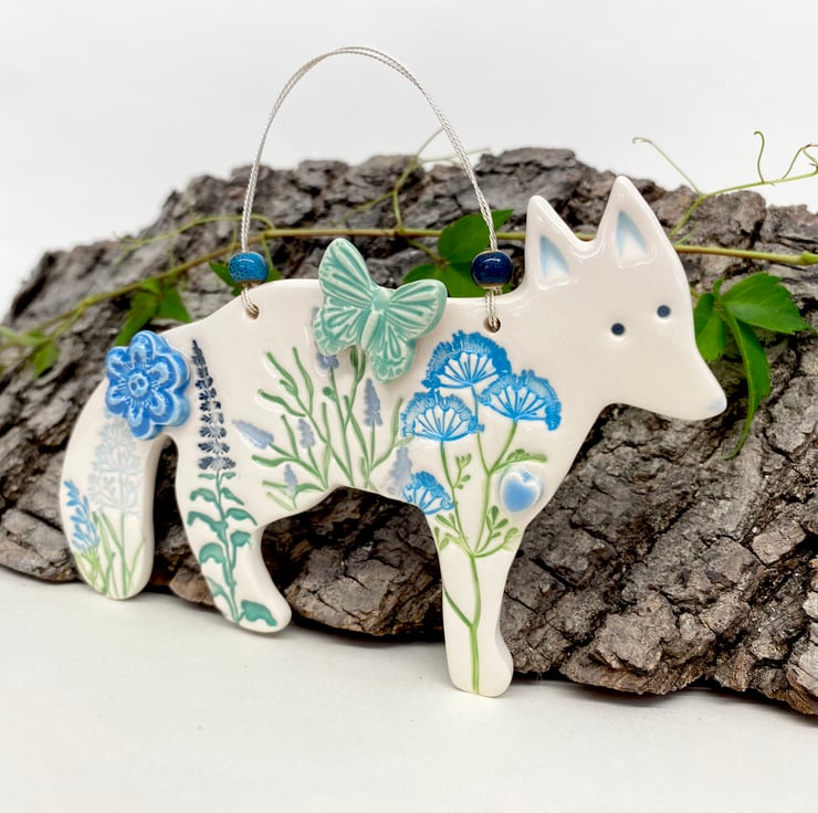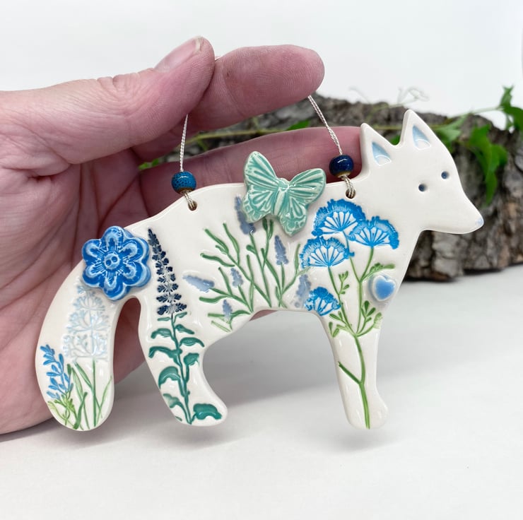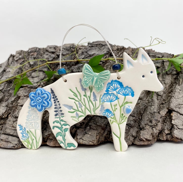 This fox decoration has been made from white earthenware clay and decorated with pattern and raised features. It has been fired twice and finished with a clear, glossy glaze. Glazed on the front only. It measures 12.5cm x 6cm x 1cm deep and hangs from a double stranded, twisted silver wire with ceramic beads.