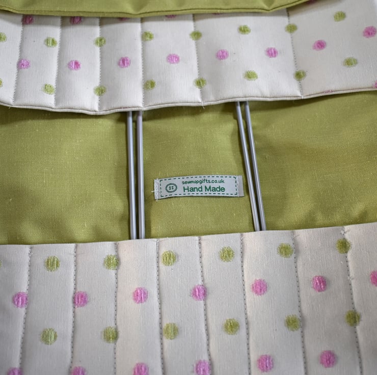 Pretty and practical storage roll for knitting needles and crochet hooks. Laura Ashley spot fabrics. Wadded and interfaced to provide protection and shape to the case.