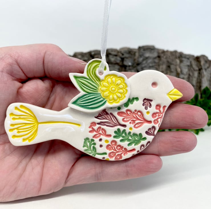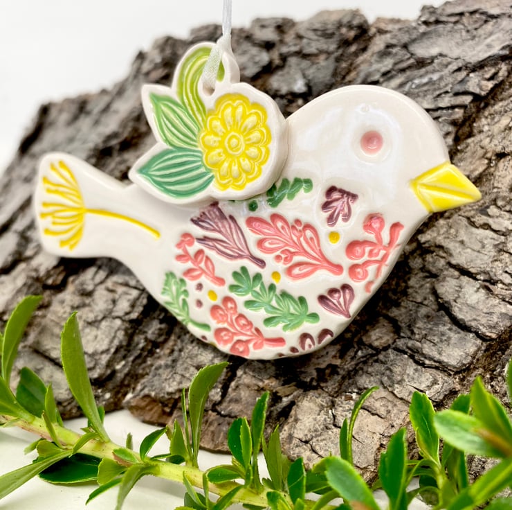 This cute little pottery bird has been hand-cut from white earthenware clay, decorated with colour and fired. It has then been glazed with a lovely glossy clear glaze and fired again to 1100 degrees. It hangs from a cream organza ribbon. 10.5cm wide x 8cm high x 0.8cm deep.