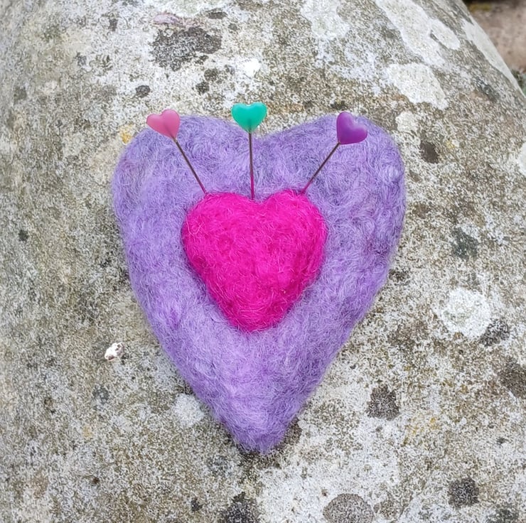 A heart shaped pin cushion made from the fleece of my lovely Gotland flock, hand dyed and felted.