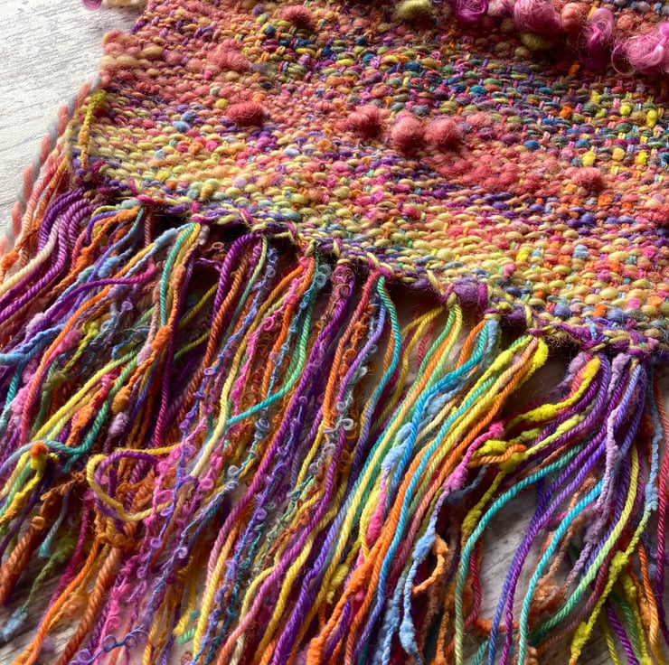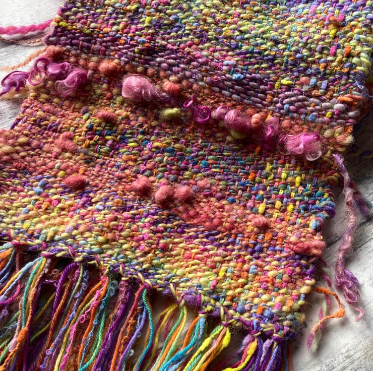 Beautifully soft and drapey scarf made with a blend of Blue faced Leicester, Corriedale and merino fibres, dyed by me and then hand spun on my spinning wheel into yarn and finally woven into this delightfully soft scarf on my rigid heddle loom.