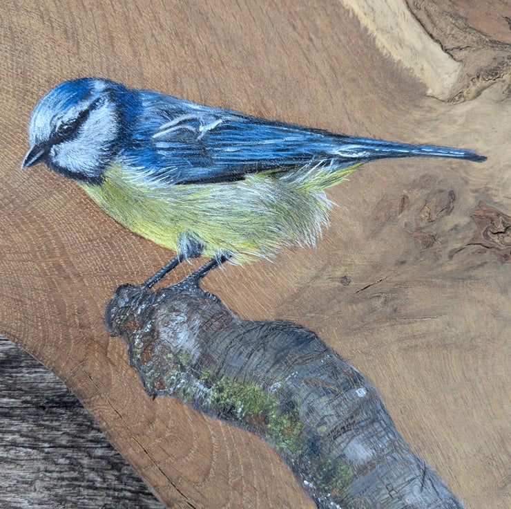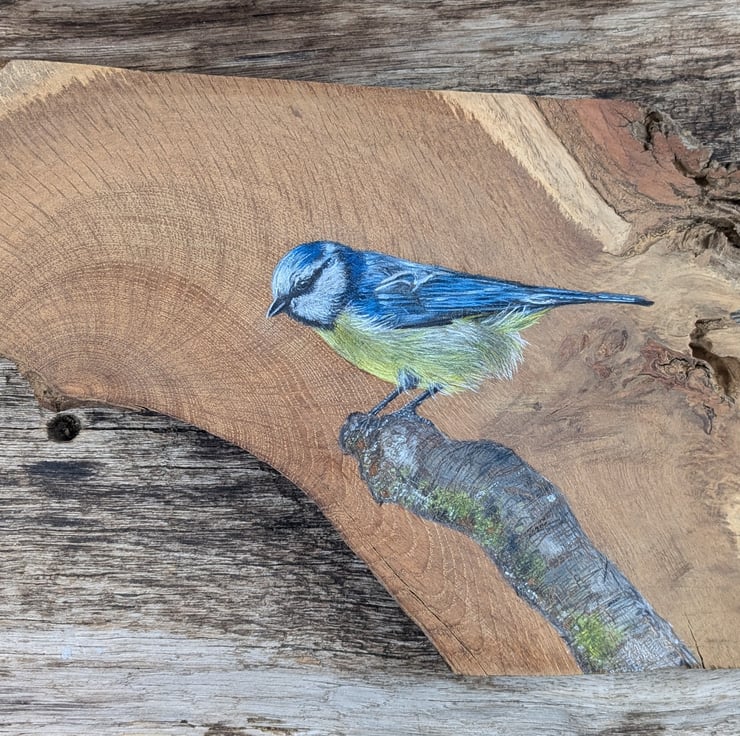 'Hope' is a beautiful blue tit, created using watercolour paint, watercolour pencils and polychromo pencils on a gorgeous piece of reclaimed oak.