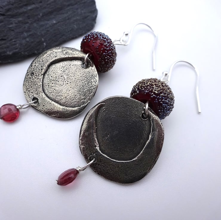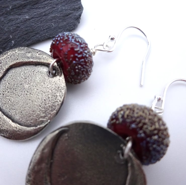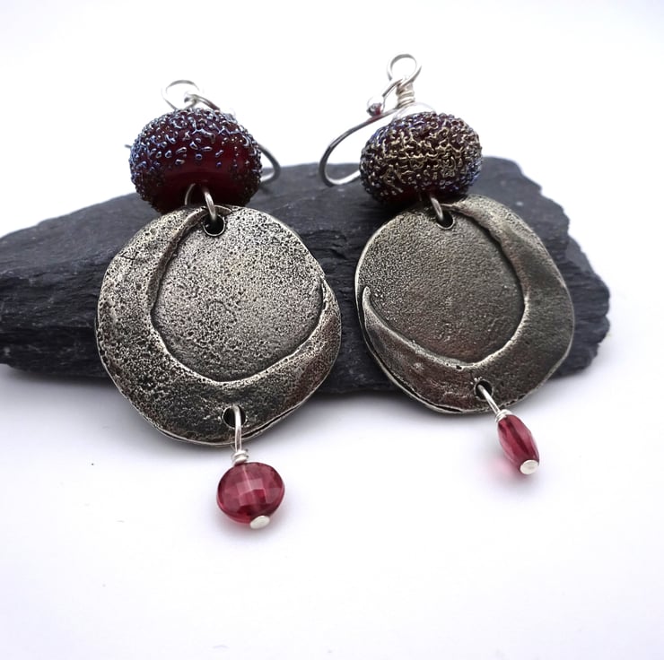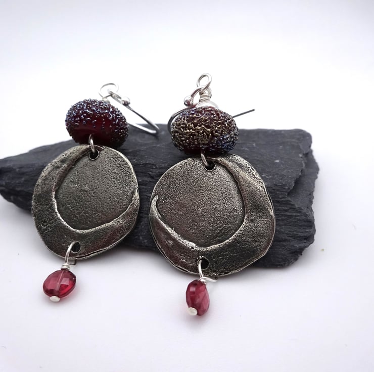 A pair of earrings made with sterling silver ear wires, handmade lampwork red glass beads, handmade pewter moon connectors and Grade AA Rhodolite Garnet beads.