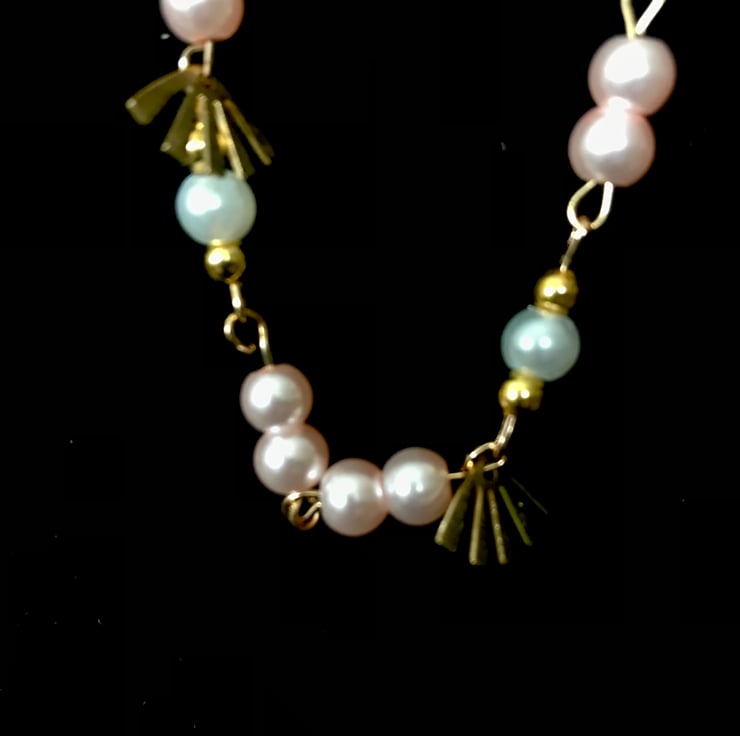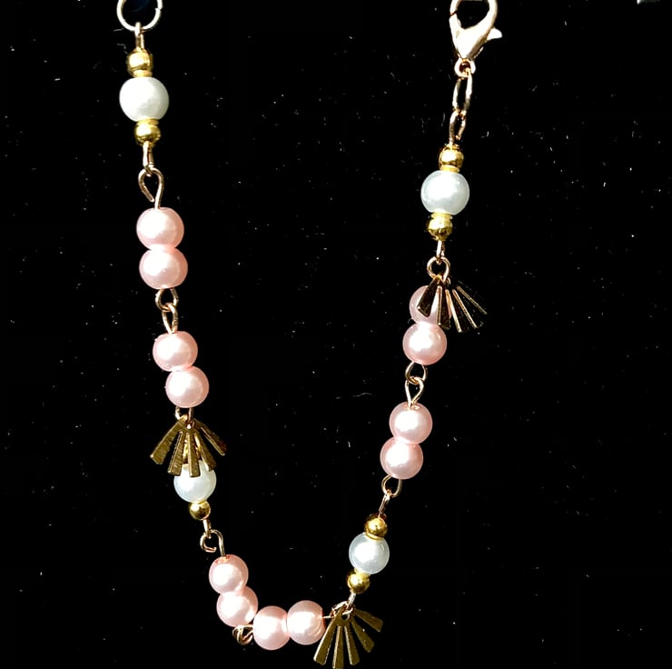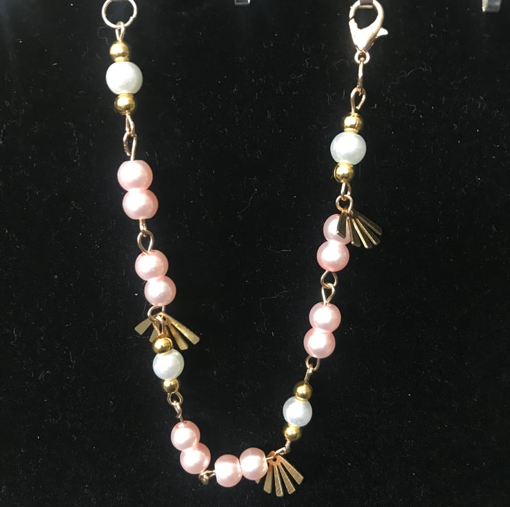 This bracelet is made with high quality anti tarnish gold plated jewellery wire and features beautiful glossy creamy pink and white pearls with gold fan charms. It is very eye catching and elegant. To maintain the shine and quality it is best to avoid showering etc with it on.