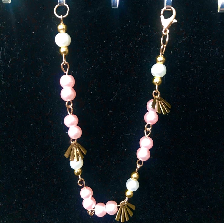 This bracelet is made with high quality anti tarnish gold plated jewellery wire and features beautiful glossy creamy pink and white pearls with gold fan charms. It is very eye catching and elegant. To maintain the shine and quality it is best to avoid showering etc with it on.