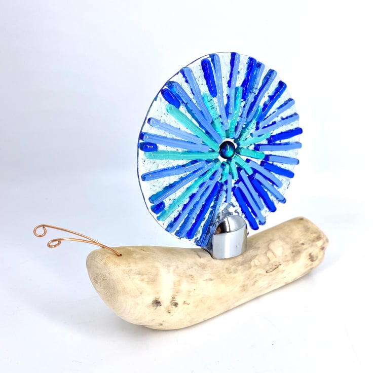 A cute snail made from fused glass and driftwood with copper wire antennae.