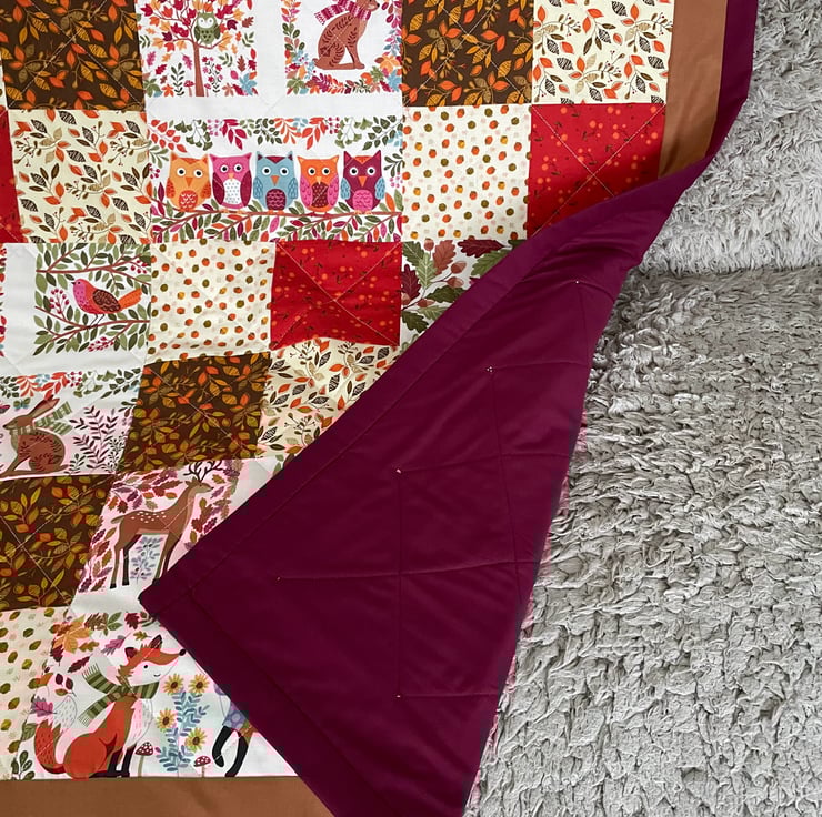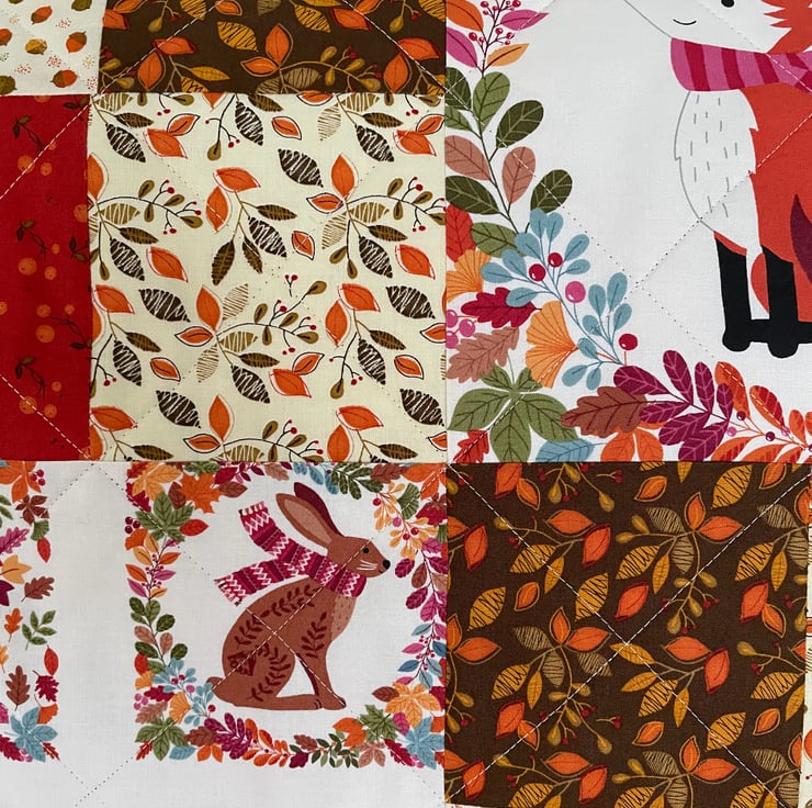 Beautiful handmade patchwork quilt or throw. Made with patchwork squares in Riley Blake Adele in Autumn fabric. These are mixed with picture blocks from the Makower Autumn Days fabric panel featuring woodland animals. Quilt is in lovely autumn shades of yellow, orange, brown, rust and maroon. Quilt is backed with coordinating rust fabric and bound with maroon. All fabric is high quality quilting fabric 100% cotton. Wadding is bamboo cotton blend. Size 40 x 40 ins approximately.