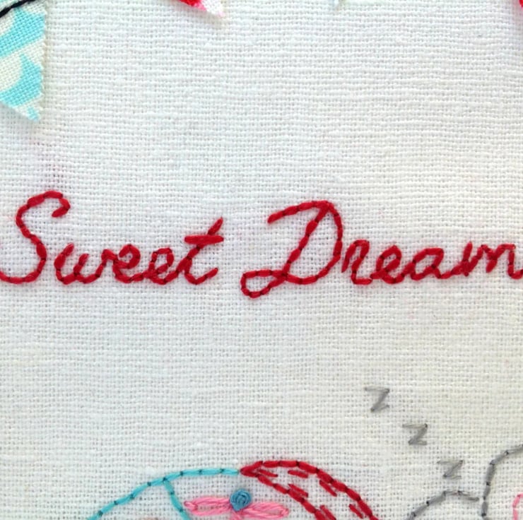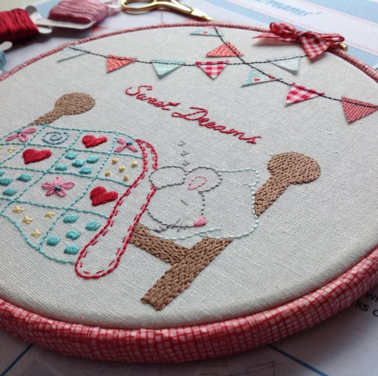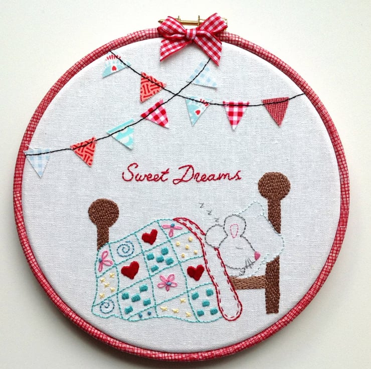 What a peaceful wee soul this little mouse is, fast asleep under a snuggly patchwork quilt! The mini bunting is super cute and the little patchwork quilt is a fun way to show off different stitches.