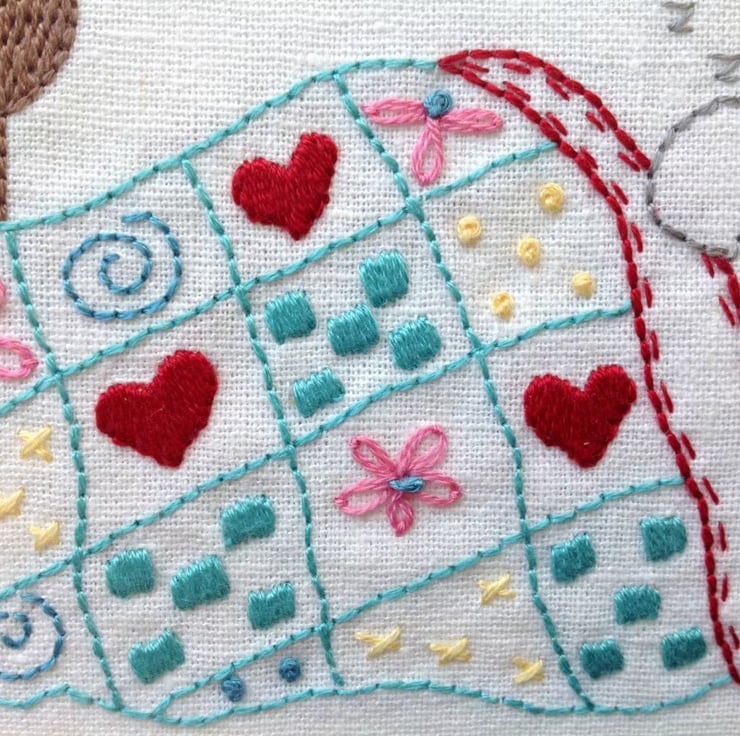This is a fairly simple embroidery that uses very easy stitches. The pattern contains clear instructions on how to construct this adorable little stitchery, with lots of clear, close up colour photographs to help you along. You will be able to zoom in on the pictures on your computer, if you want to see details even more clearly. The pattern also includes step-by-step instructions on how to decorate your embroidery hoop and how to finish your hoop art at the back.